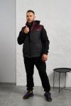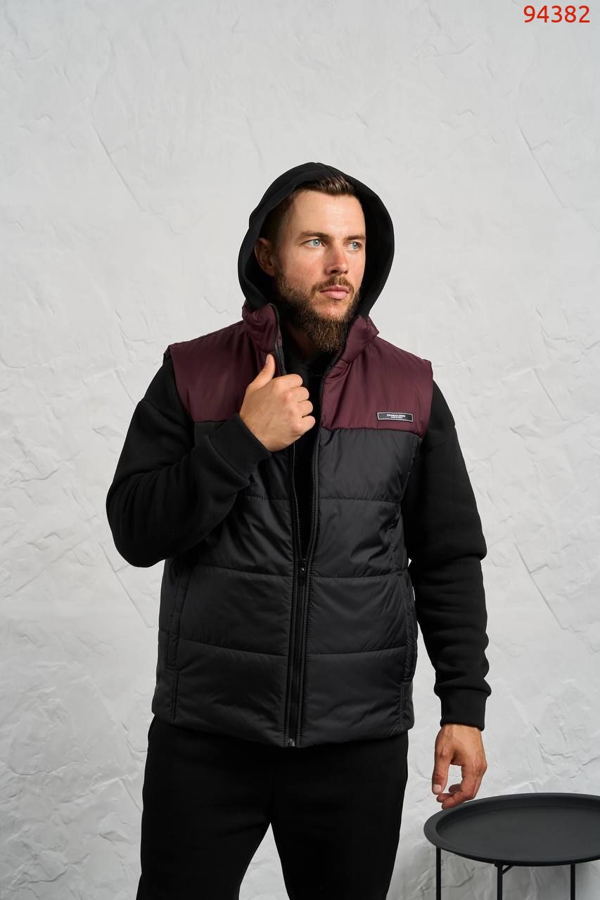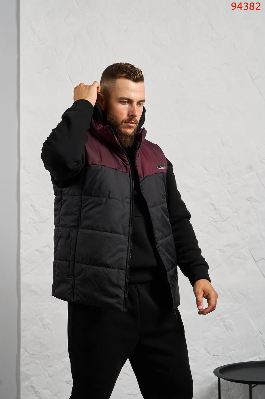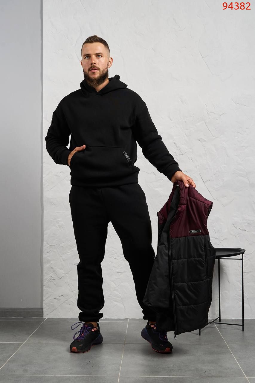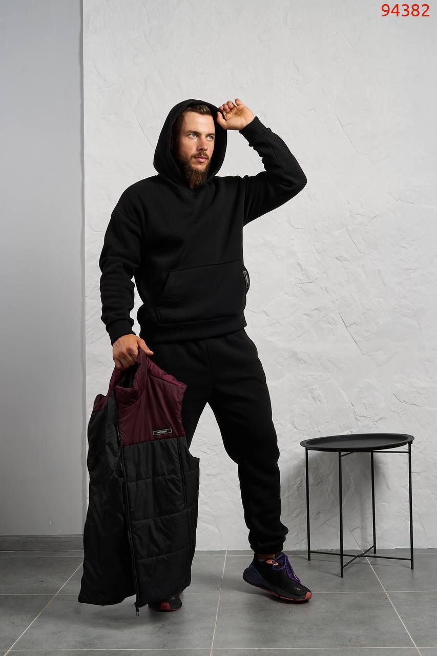Стильний чоловічий комплект для прохолодної погоди. Складається з утепленого жилета та зручного бтеплого спортивного костюма, з кишенею кенгуру, збоку прикрашен нашивкою, з капюшоном. Рукава на манжетах. Штани прямі, висока посадка з кишенями, і знизу на гумці. Жилет