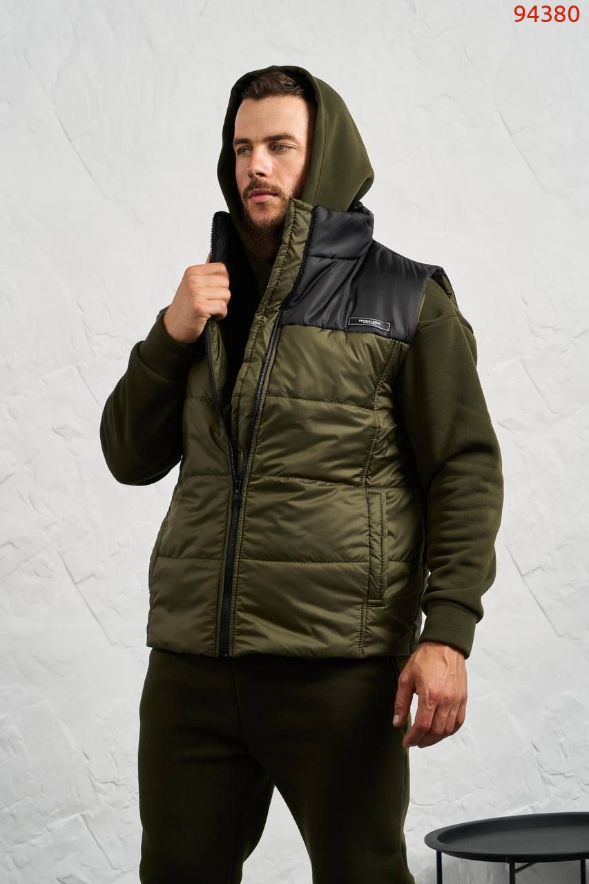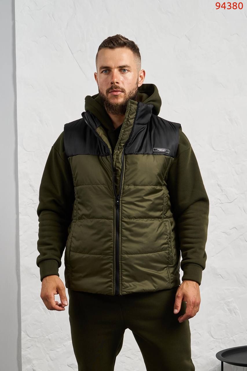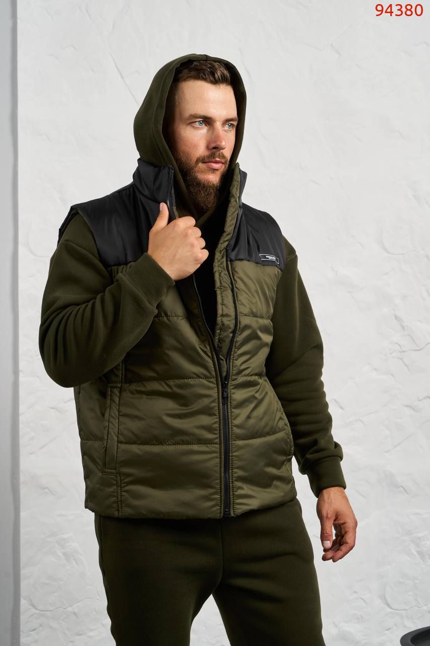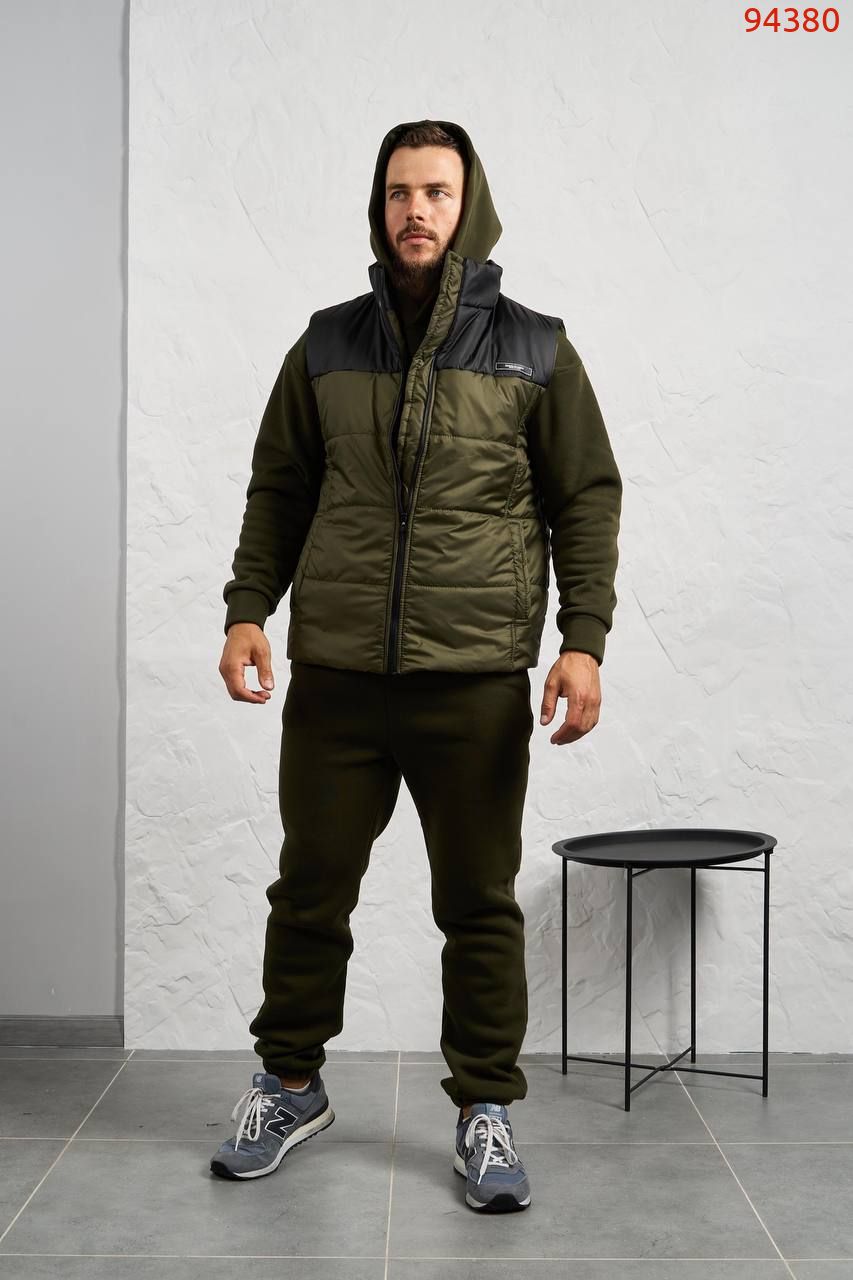 Стильний чоловічий комплект для прохолодної погоди. Складається з утепленого жилета та зручного бтеплого спортивного костюма, з кишенею кенгуру, збоку прикрашен нашивкою, з капюшоном. Рукава на манжетах. Штани прямі, висока посадка з кишенями, і знизу на гумці. Жилет