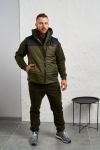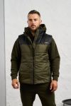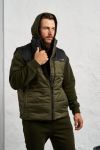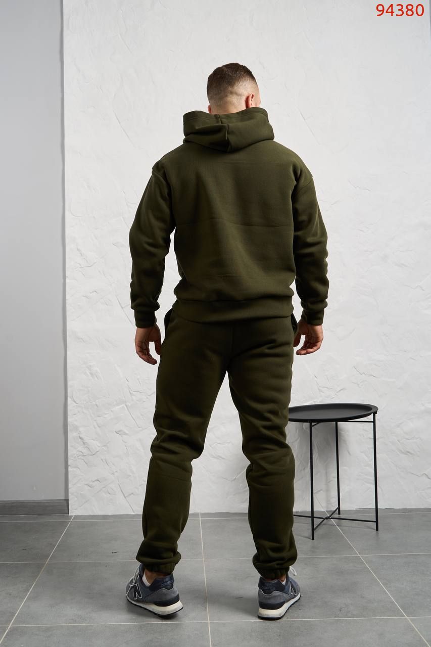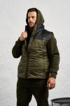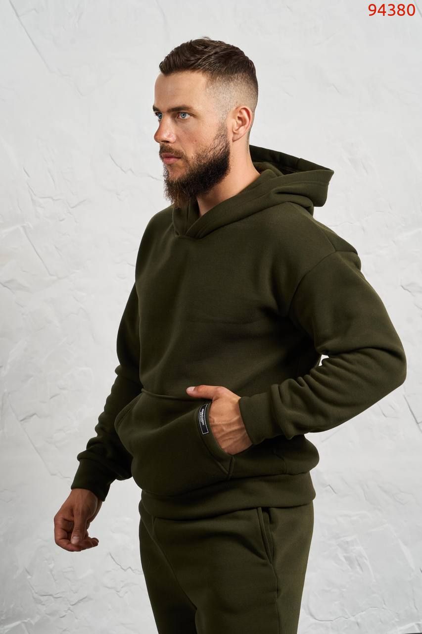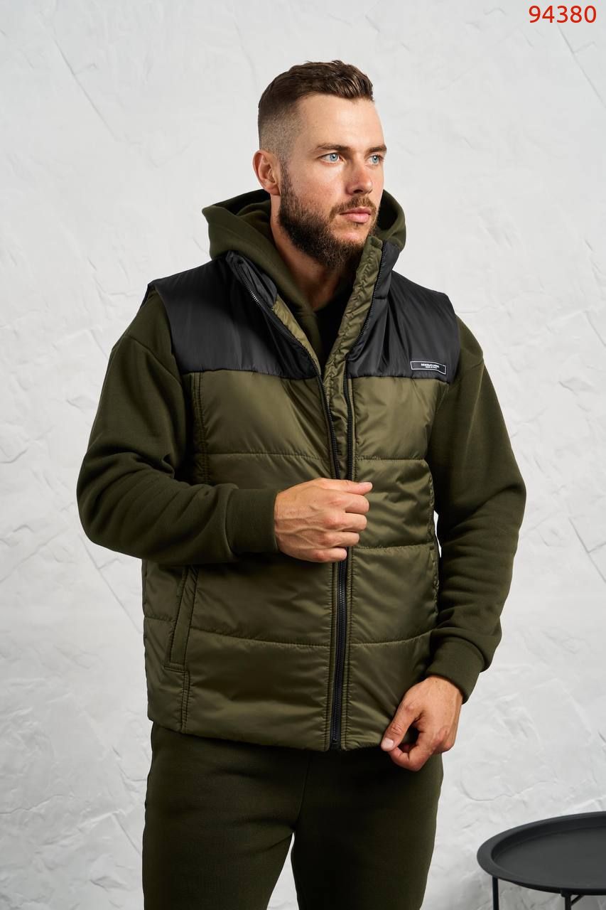 Стильний чоловічий комплект для прохолодної погоди. Складається з утепленого жилета та зручного бтеплого спортивного костюма, з кишенею кенгуру, збоку прикрашен нашивкою, з капюшоном. Рукава на манжетах. Штани прямі, висока посадка з кишенями, і знизу на гумці. Жилет