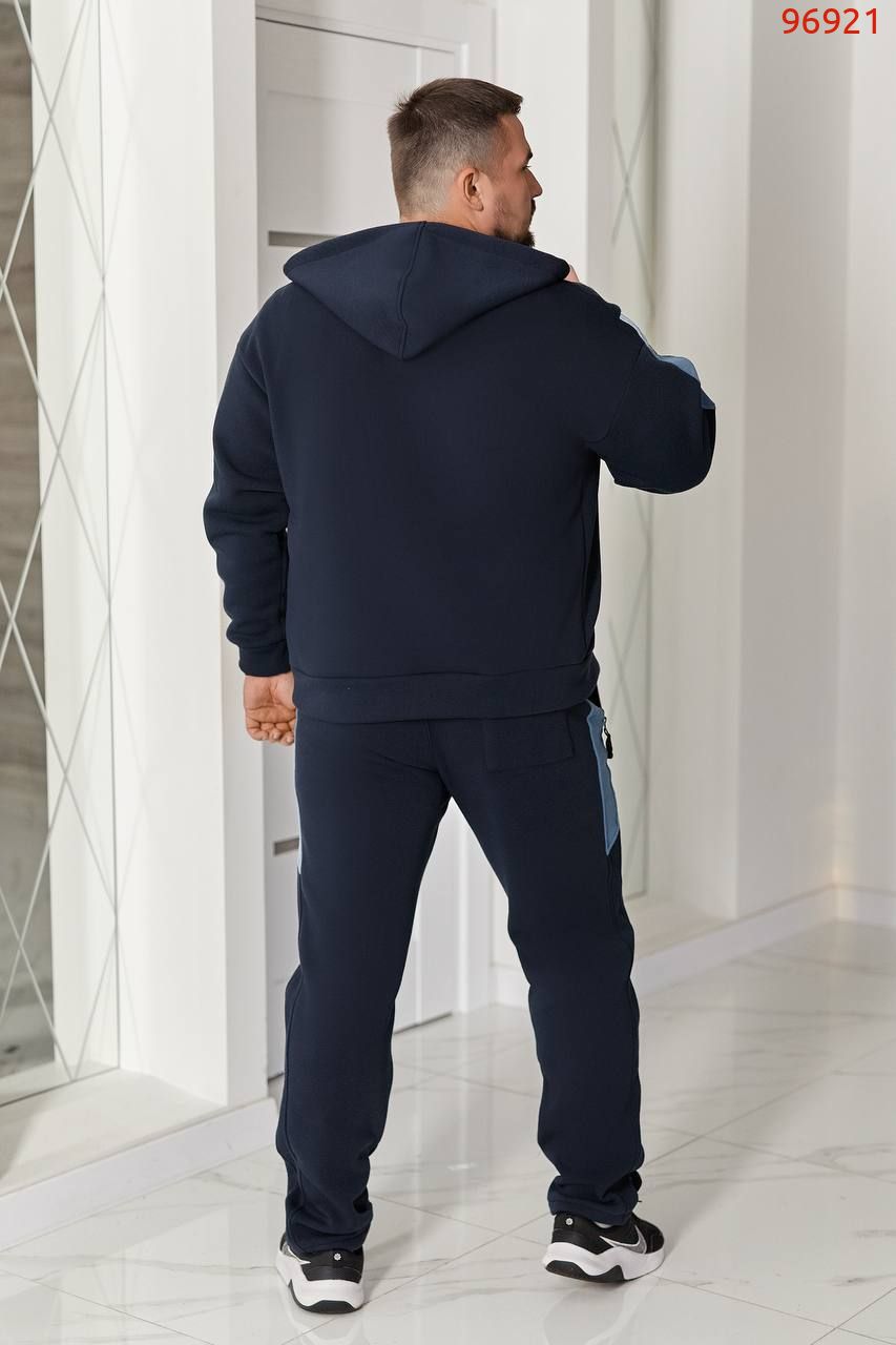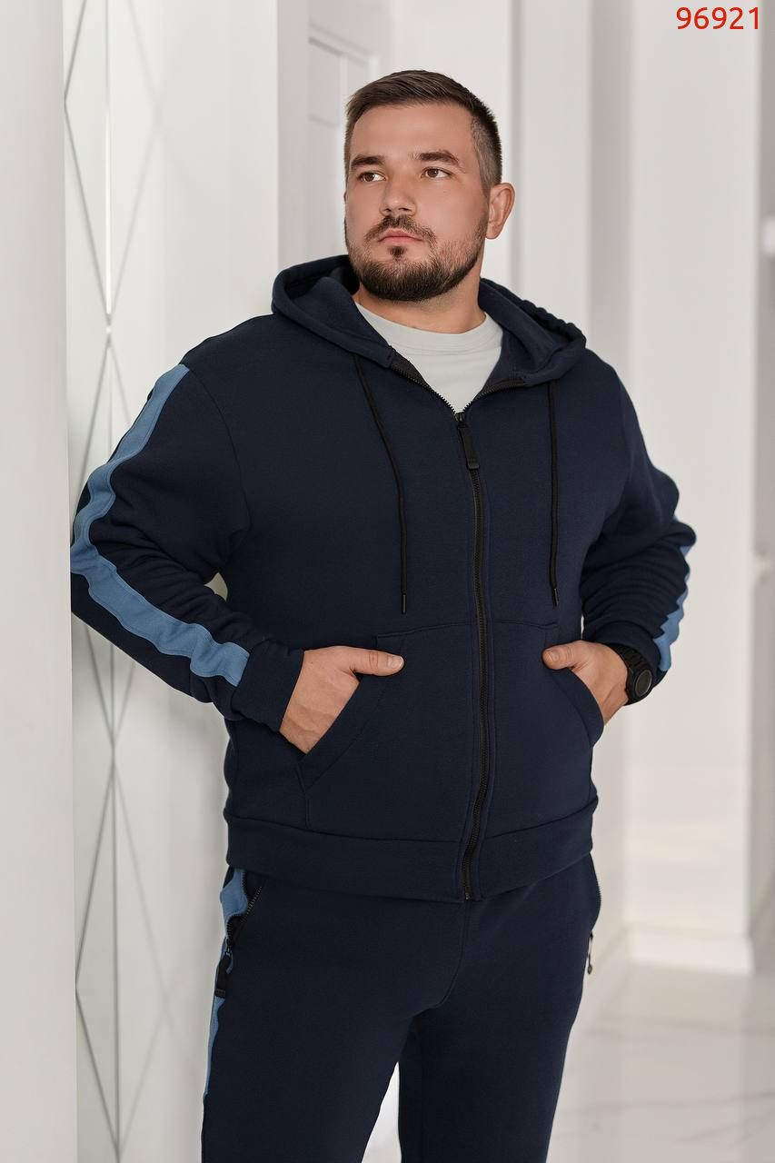 Худі прямого силуету, має зручний капюшон зі шнурками та центральну застібку-блискавку. Дві кишені кенгуру надають практичності. Низ виробу та манжети рукава на широкому трикотажному манжеті .Контрастні лампаси на рукавах і штанах роблять образ виразним та сучасним.