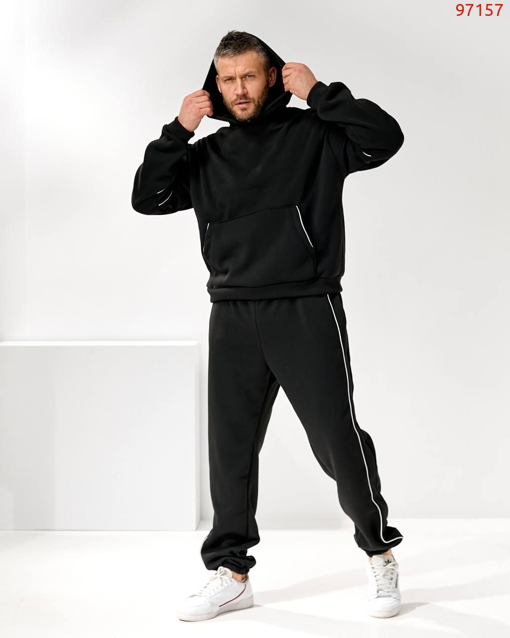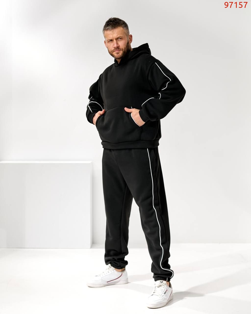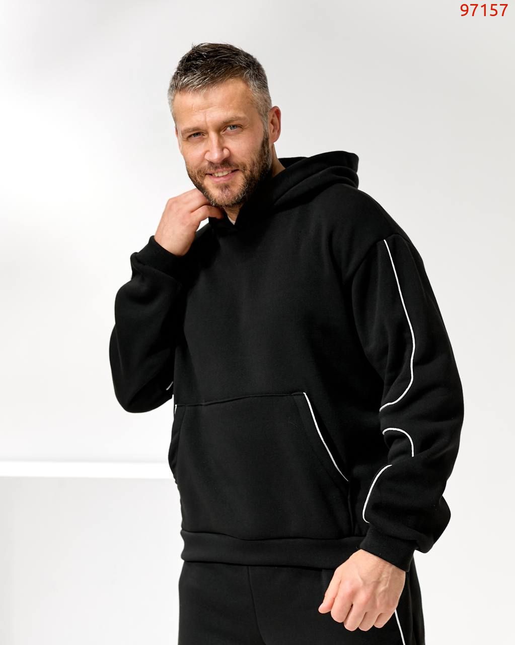 Чоловічий костюм з трьох нитки – це втілення комфорту і стилю в повсякденному одязі. М'яка тканина дбайливо зберігає тепло, дозволяючи шкірі дихати, а сучасний крій підкреслює мужність і свободу рухів. Костюм ідеально підходить як для прогулянок у прохолодну погоду, так і для домашнього затишку. Лаконічний дизайн робить його універсальним рішенням: він однаково органічно виглядає і в розслабленому, і в більш активному образі.