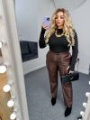 Брюки прямого крою з якісної еко-шкіри люкс. Тканина не тріскається, не розтягується та не втрачає колір. Завищена талія, резинка по спинці, блискавка, трикотаж на велюрі, дуже приємні та мʼякі з середини.