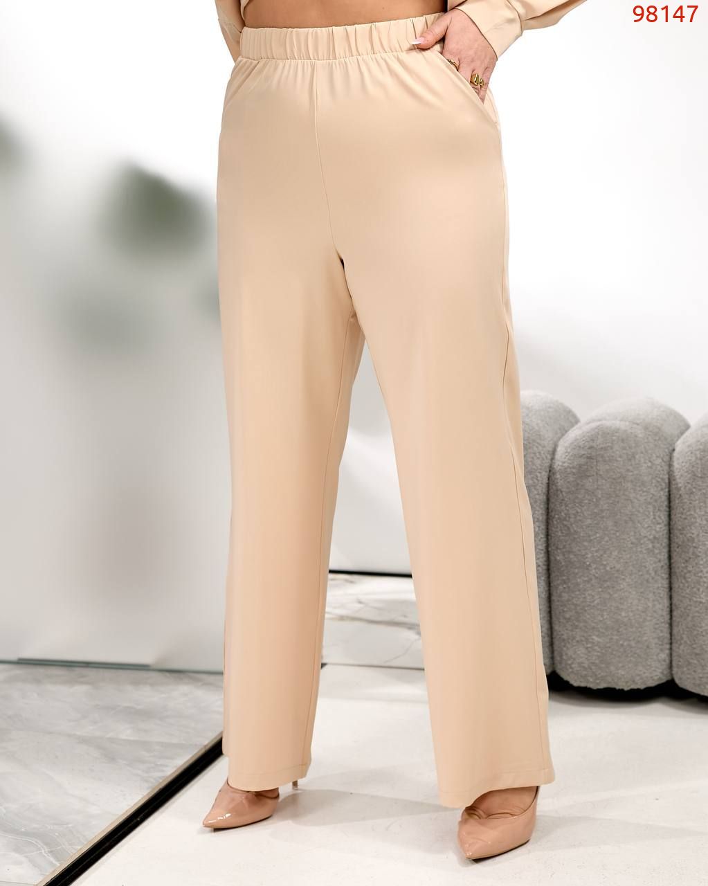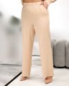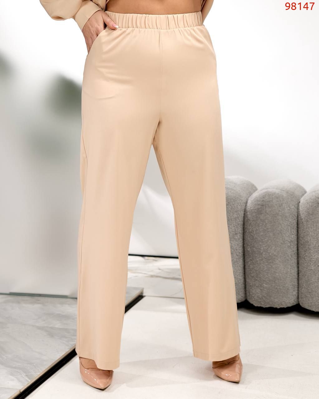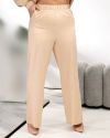 Штани вільного крою прямі, посадка висока, в поясі на гумці, з кишенями.