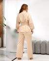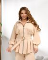 Блуза напівприталеного силуету,спереду і по спинці на талії з мʼякими складками , що формують ефектну баску. Спереду- золотиста застібка блискавка. Рукав: довгий, об’ємний , низ рукава зібраний на манжету.