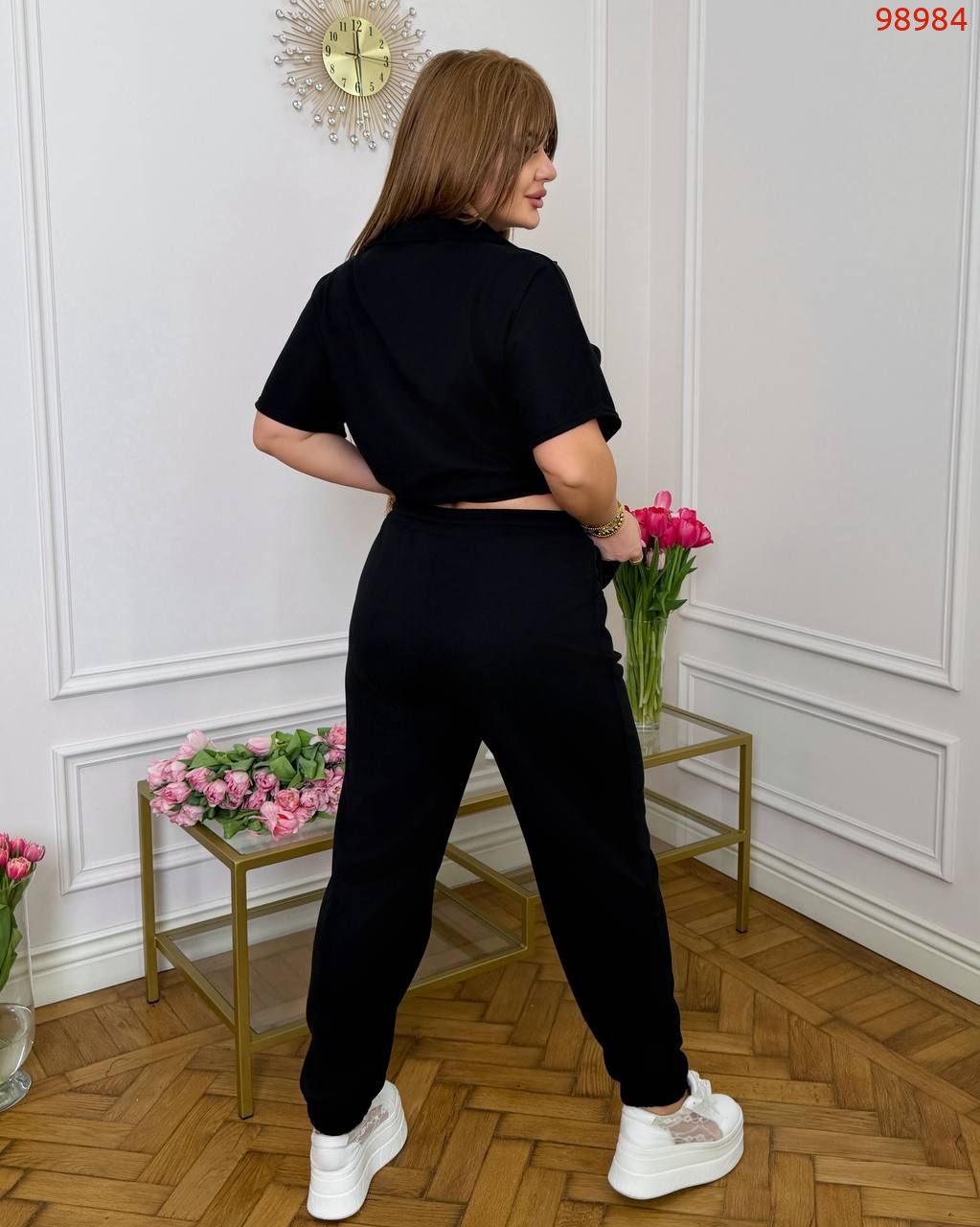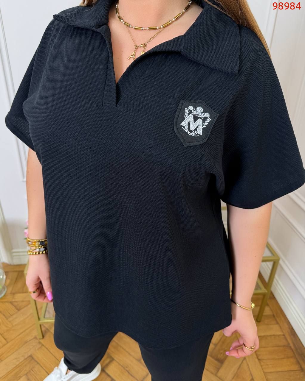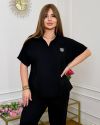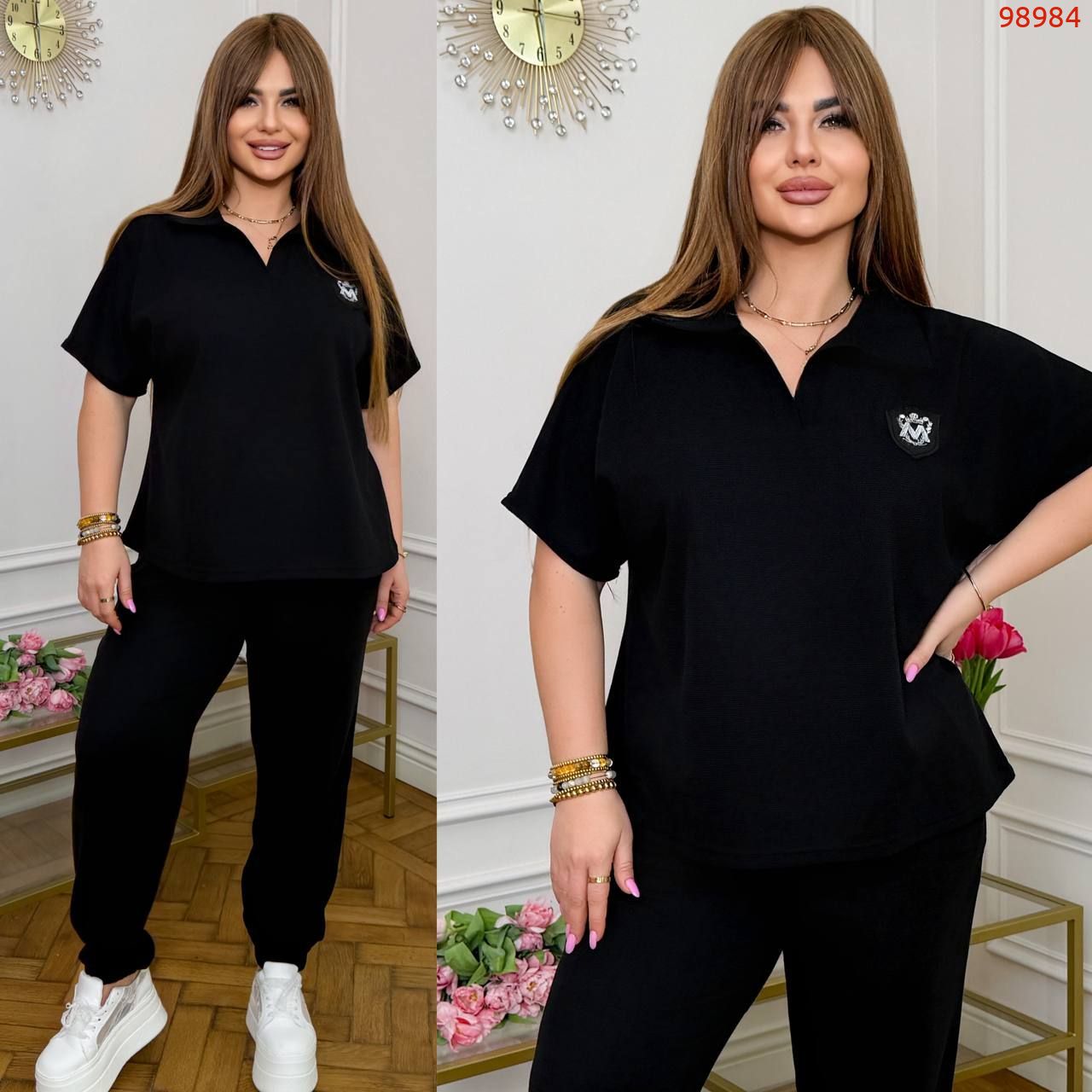 Тканина: трикотаж еластан: футболка поло у стилі оверсайз з Акс + штани з високою посадкою на еластичній гумці, з кишенями в бічних швах, низ штанів на гумці