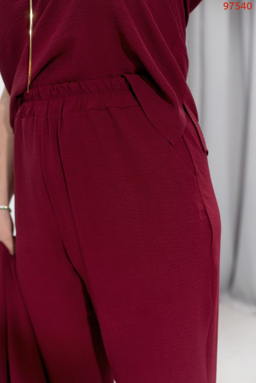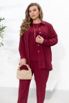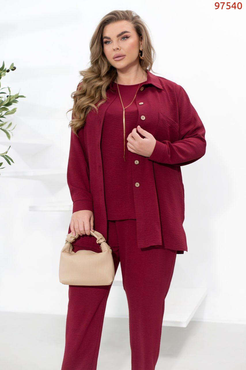 Елегантний та стильний костюм трійка великого розміру. Верхня сорочка подовжена, з відкладним комірцем, на грудях накладна кишеня, з боків - довгі розрізи. На рукавах манжети, на манжетах по одному гудзику. Брюки з високою талією, з боків - кишені в шві, до поясу вшито резинку. Майка з півкруглим вирізом горловини, на грудях виточки, з боків подолу - розрізи. Без кишень і застібок.