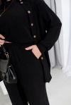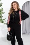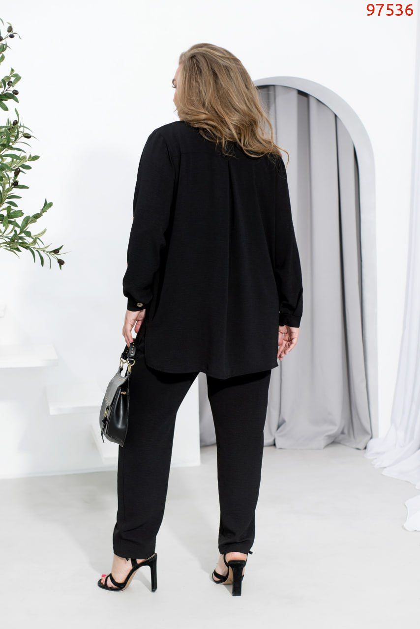 Елегантний та стильний костюм трійка великого розміру. Верхня сорочка подовжена, з відкладним комірцем, на грудях накладна кишеня, з боків - довгі розрізи. На рукавах манжети, на манжетах по одному гудзику. Брюки з високою талією, з боків - кишені в шві, до поясу вшито резинку. Майка з півкруглим вирізом горловини, на грудях виточки, з боків подолу - розрізи. Без кишень і застібок.