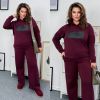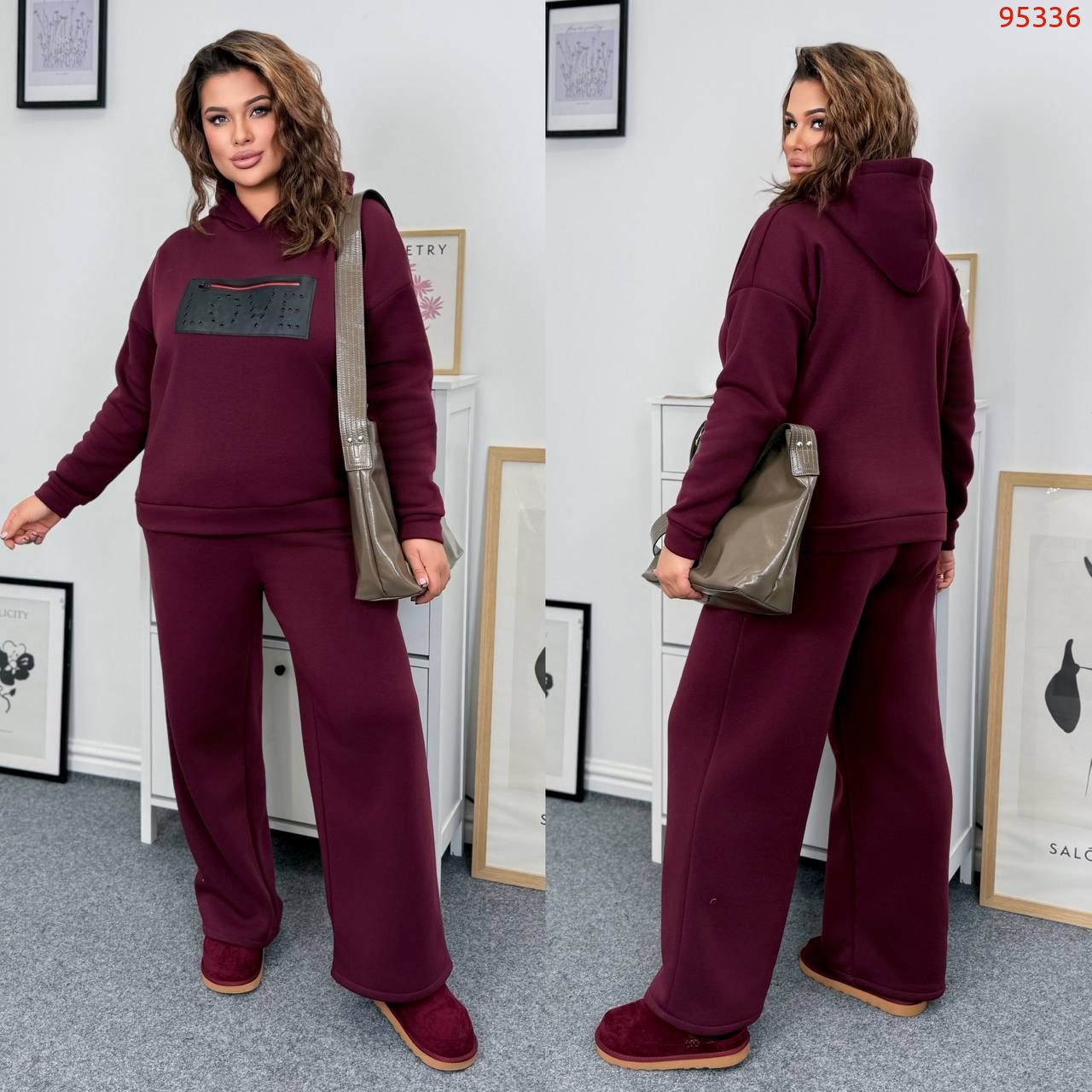 Теплий костюм на холодну пору . Світшот на манжеті , з капюшоном . Широкі штани з високою посадкою , пояс на гумці , бічні кишені .