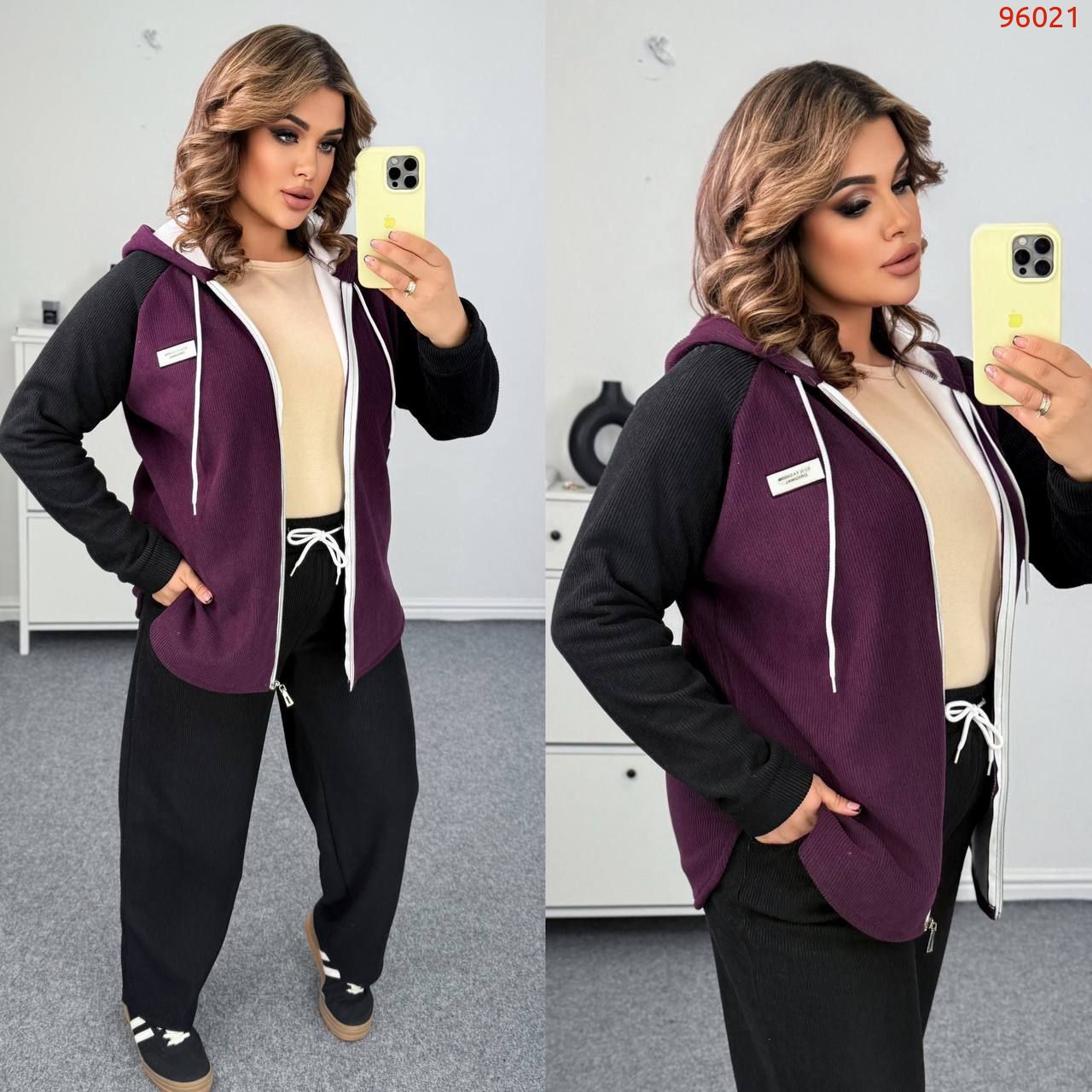 Довжина штанів : 108 см. Теплий костюм на холодну пору . Штани з високою посадкою , пояс на гумці та шнуркі . Кофта прямого покрою , з капюшоном , на блискавці , рукав реглан .