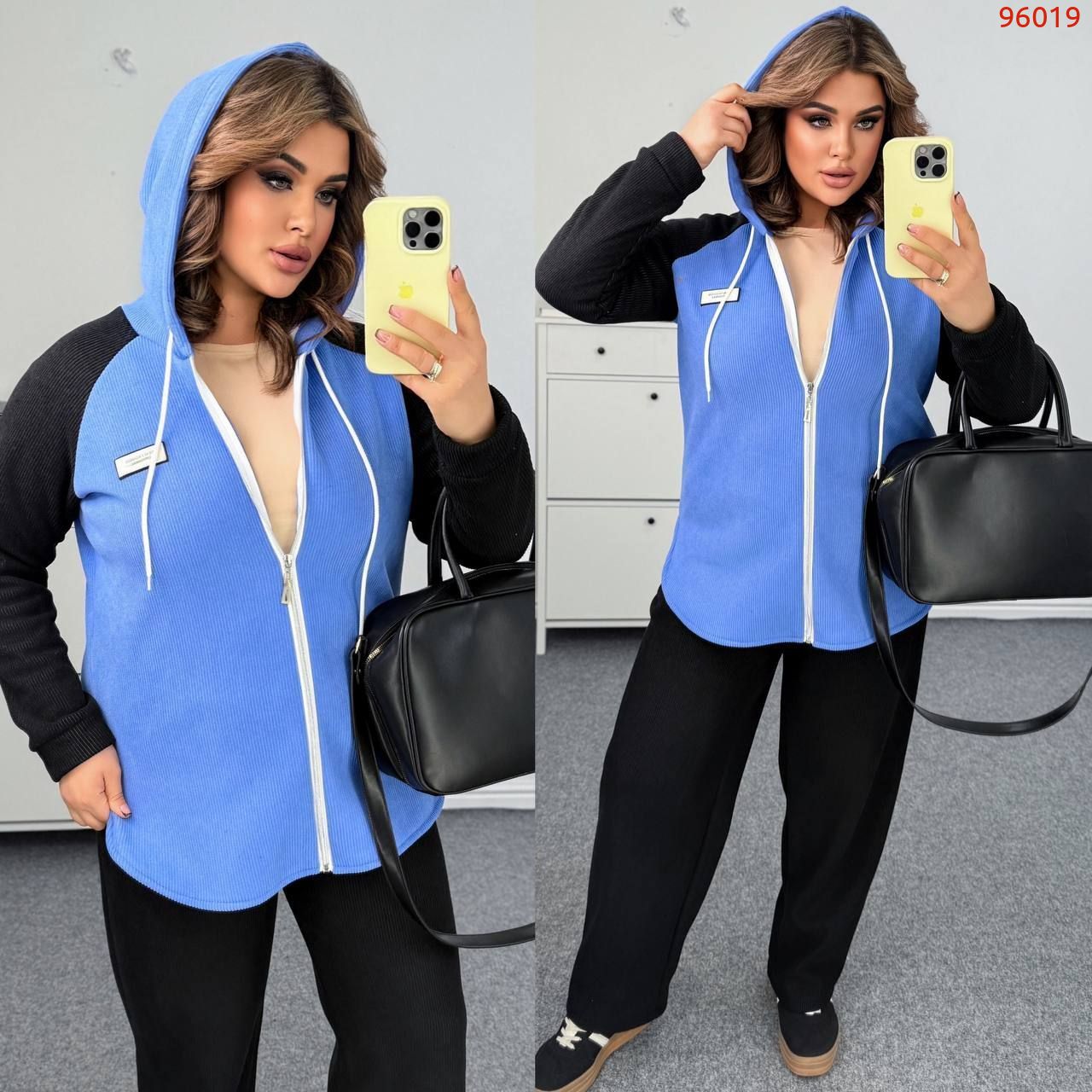 Довжина штанів : 108 см. Теплий костюм на холодну пору . Штани з високою посадкою , пояс на гумці та шнуркі . Кофта прямого покрою , з капюшоном , на блискавці , рукав реглан .