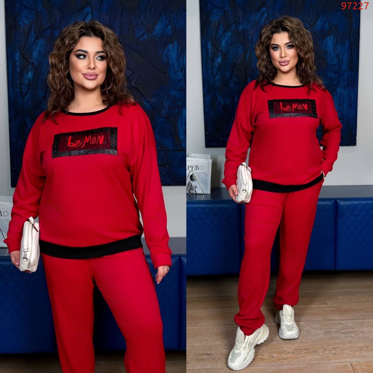 Довжина штанів : 106 см. Штани з високою посадкою , пояс на гумці , низ на манжеті . Кофта прямого покрою на манжеті , з якісною нашивкою .