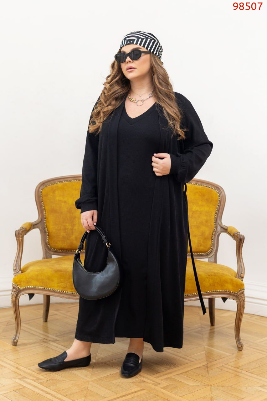 Комплект, у якому поєднуються стиль і максимальний комфорт.Максі-сукня прямого крою красиво витягує силует і м’яко підкреслює фігуру. Еластичний трикотаж у рубчик приємний до тіла, добре тягнеться та тримає форму. Довгий кардиган із поясом дозволяє зробити акцент на талії, має зручні кишені та акуратні манжети на рукавах – деталь, що додає завершеності образу. Ідеальний варіант на щодень: змінюєш взуття й настрій – і комплект звучить по-новому