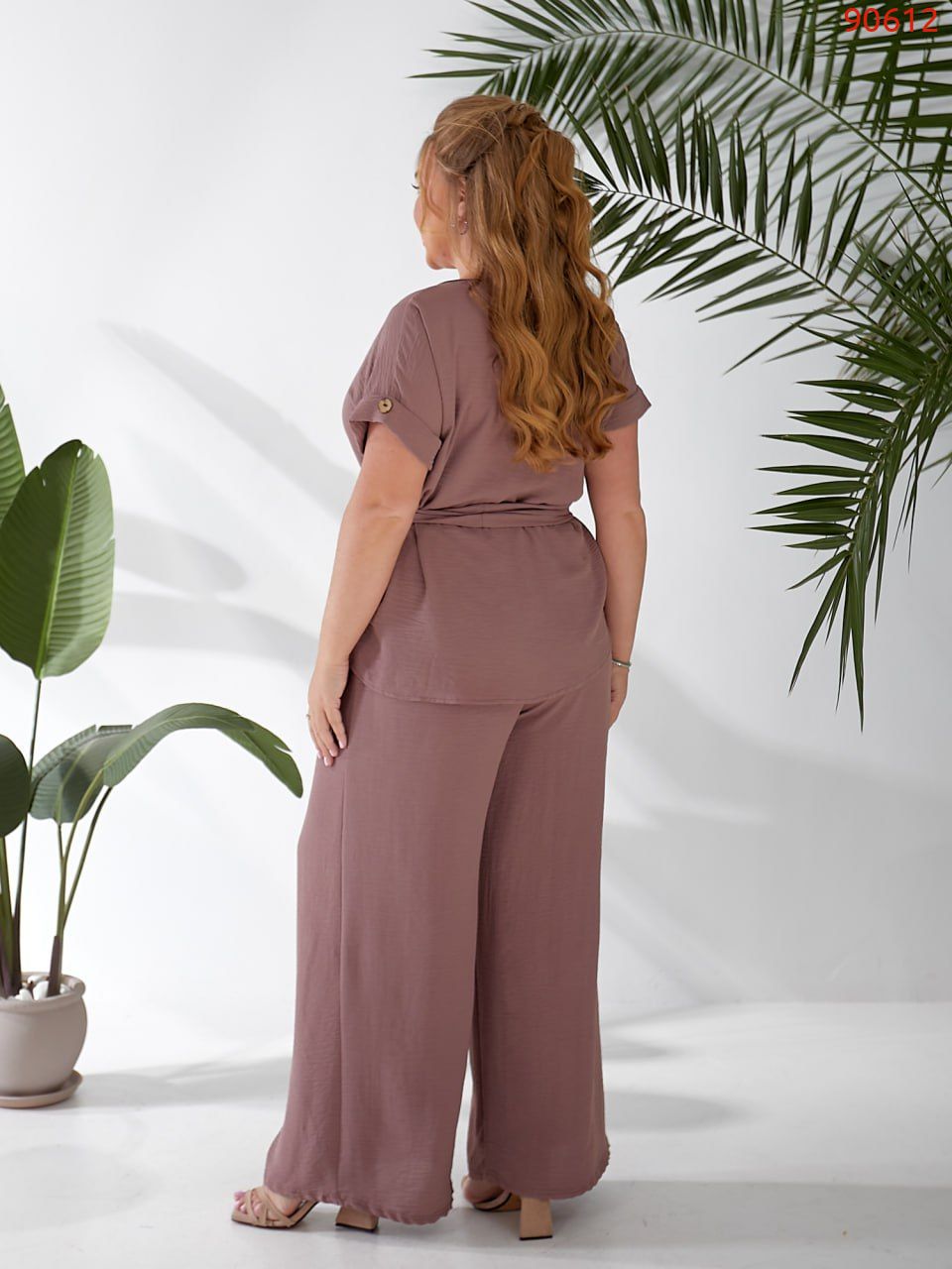 Ідеальний набір на літо. Універсальний і зручний жіночий брючний костюм, з м'якого матеріалу - "американський креп-жатка", для повсякденного носіння. Легкий, комфортний, виглядає цілісно на фігурі, візуально подовжуючи її. Блуза з суцільнокроєним рукавом, довжиною до ліктя, по низу з цільною манжетою, що відвертається, декором служить гудзик. Штани по верху з поясом на гумці. Також по верху передніх половинок односторонні складки, що надають пишність штанам, декором служать гудзики. Комплект сміливо поєднується з будь-яким взуттям.