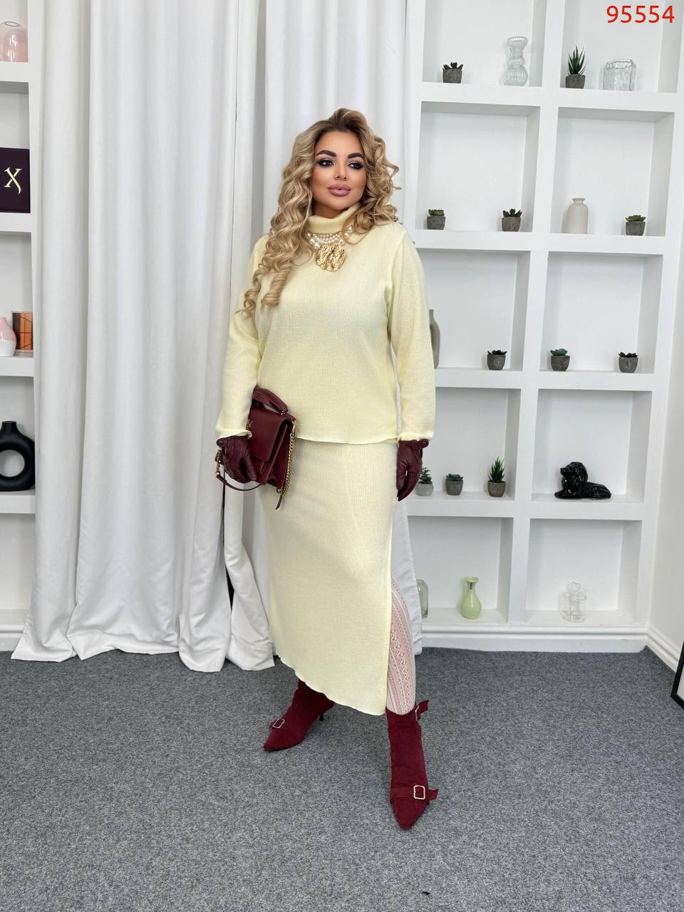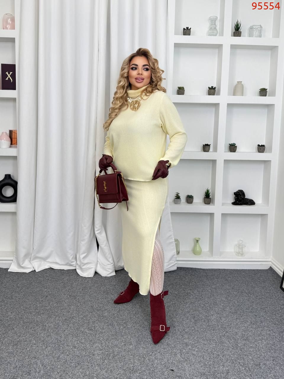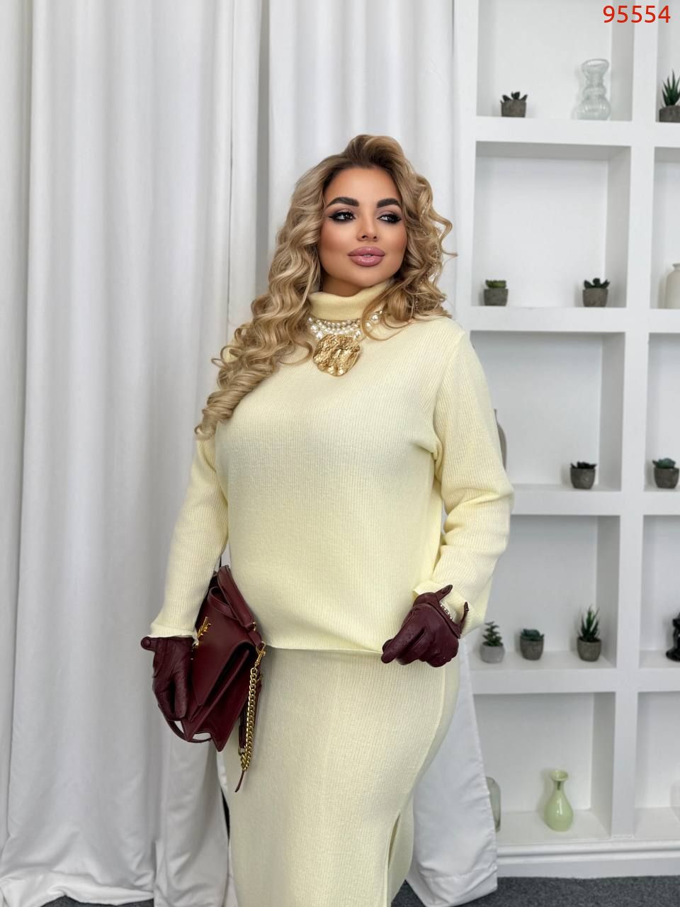 54-56 Ог 118, довжина кофти 61, талія тягнеться до 120, бедра 118, довжина спідниці 91