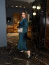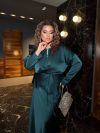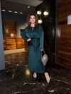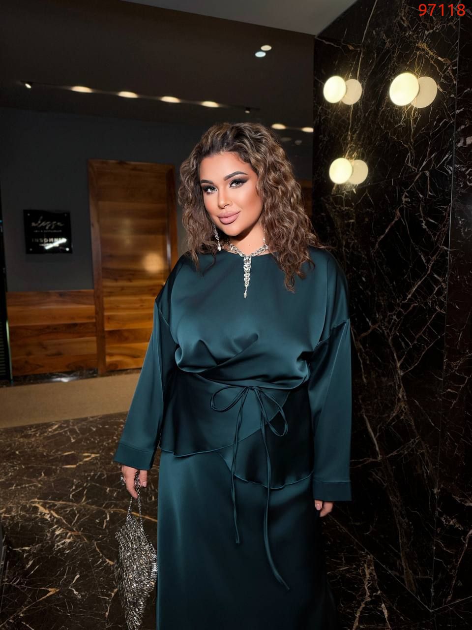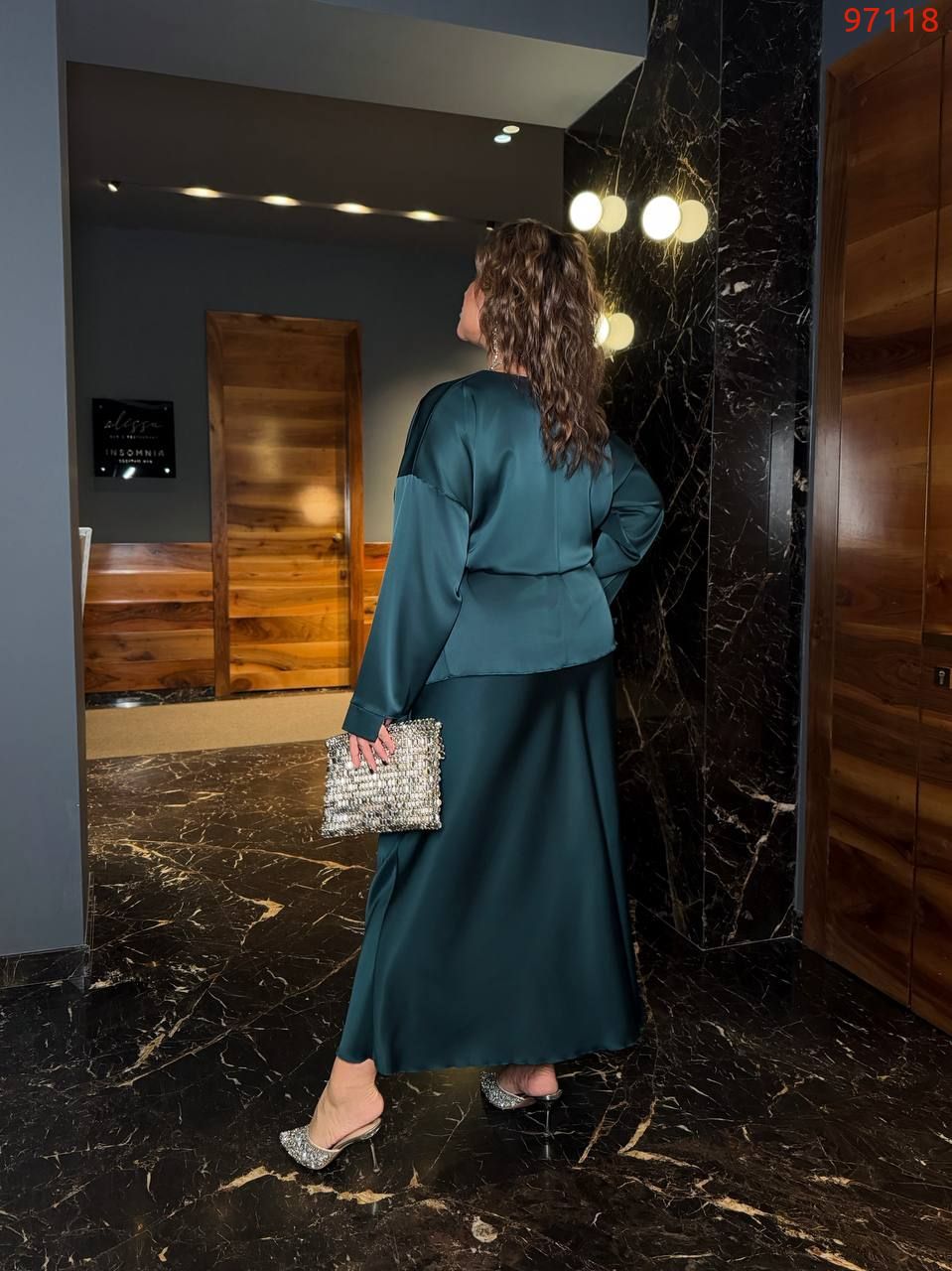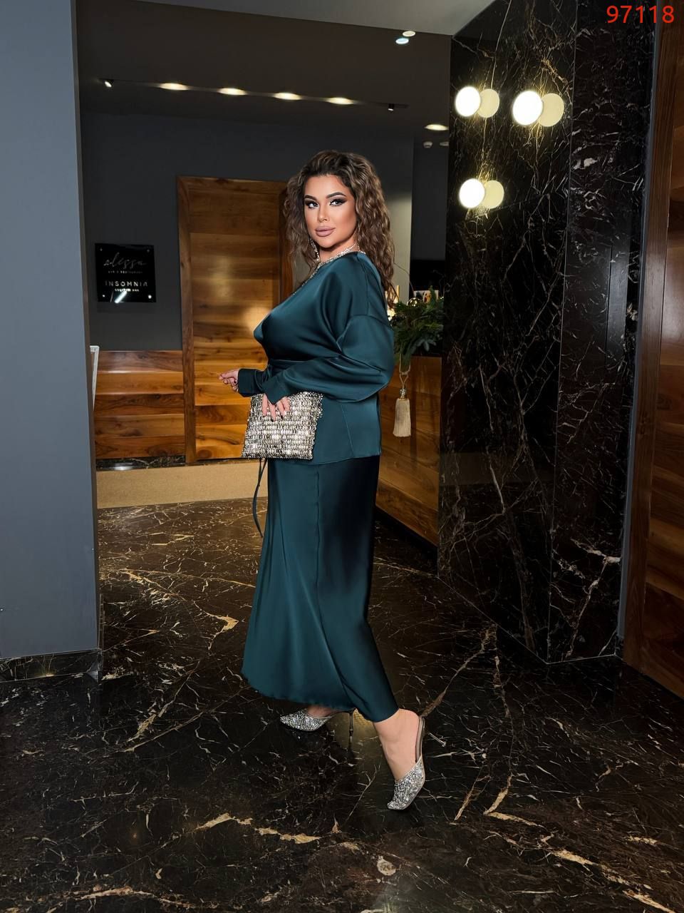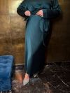 Низ комплекту – атласна спідниця довжини міді, вільного силуету, що робить образ елегантним та комфортним. Весь образ виглядає стильно, жіночно та елегантно, ідеально підходячи для особливих випадків або вечірнього виходу.
