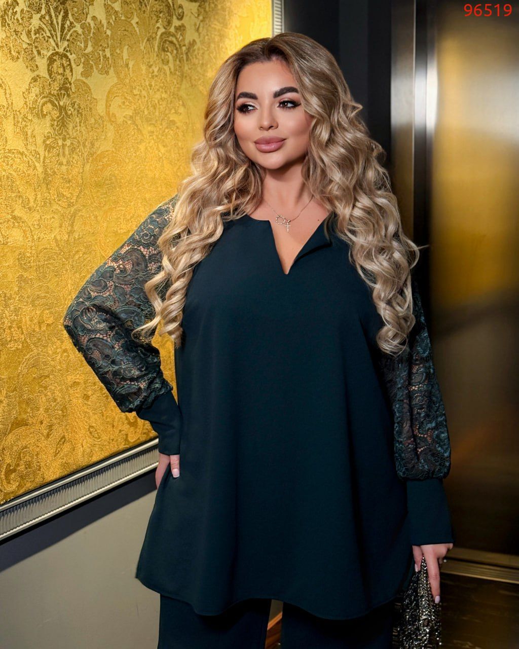 Туніка А-подібного силуету, завдяки чому чудово приховує будь-які недоліки фігури та підкреслює переваги. Горловина оригінальної форми. Рукави із гарного гіпюру в тон основної тканини, на манжетах. З боків невеликі розрізи. Застібок, кишень немає.
