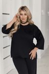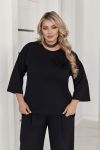 Туніка вільного прямого силуету, виріз горловини круглий, рукав 3/4. Низ асиметричний, з невеликими розрізами. Туніку декоровано трояндою із основної тканини (за потреби можна зняти). Кишень та застібок немає.