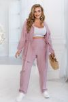 Стильний монохромний костюм – ідеальний варіант для теплої весни та спекотного літа. У комплект входять лаконічні штани на резинці з кишенями та блуза на зав'язках та резинці, вшитій по лінії таліі, виконана в формі жакета з коміром. Костюм може бути ідеально доповнений як класичними туфлями, так і лоферами чи кросівками.
