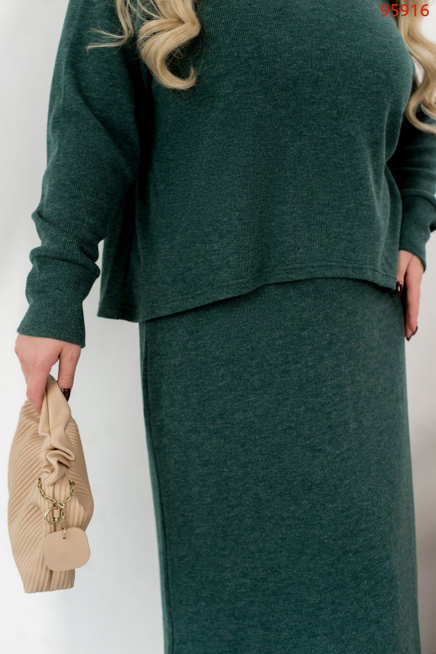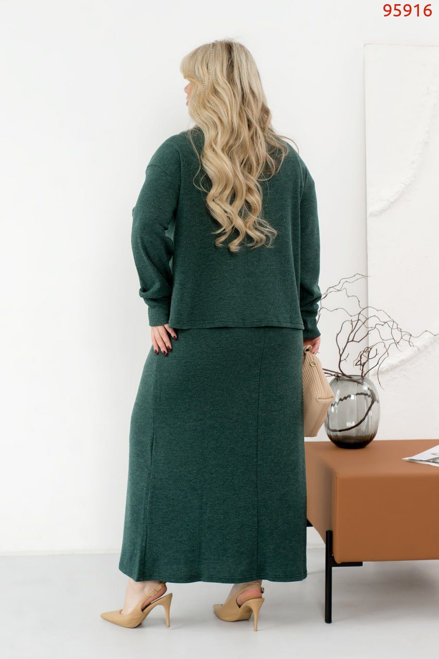 Стильний костюм, який складається з сукні та кофтинки, поєднує елегантність та комфорт в одному образі. Кофта з високою горловиною та довгими рукавами з манжетами виглядає дуже витончено, а занижена лінія плеча додає легкості та сучасного вигляду. Позаду кофтинка трохи довша, ніж спереду, що підкреслює її оригінальний стиль. Сукня максі-довжини, з прямим кроєм, створює елегантний силует, підкреслюючи витонченість фігури. Її V-подібний виріз горловини додає образу легкості та жіночності. Особливого шарму додає шов, що проходить по спинці, надаючи сукні вишуканого вигляду. Виготовлена з еластичної тканини, яка м’яко облягає тіло, сукня підлаштовується під ваші рухи, забезпечуючи максимальний комфорт і зручність. Ідеальний вибір для вечірки, урочистої події або важливого заходу, цей костюм гарантовано приверне увагу.