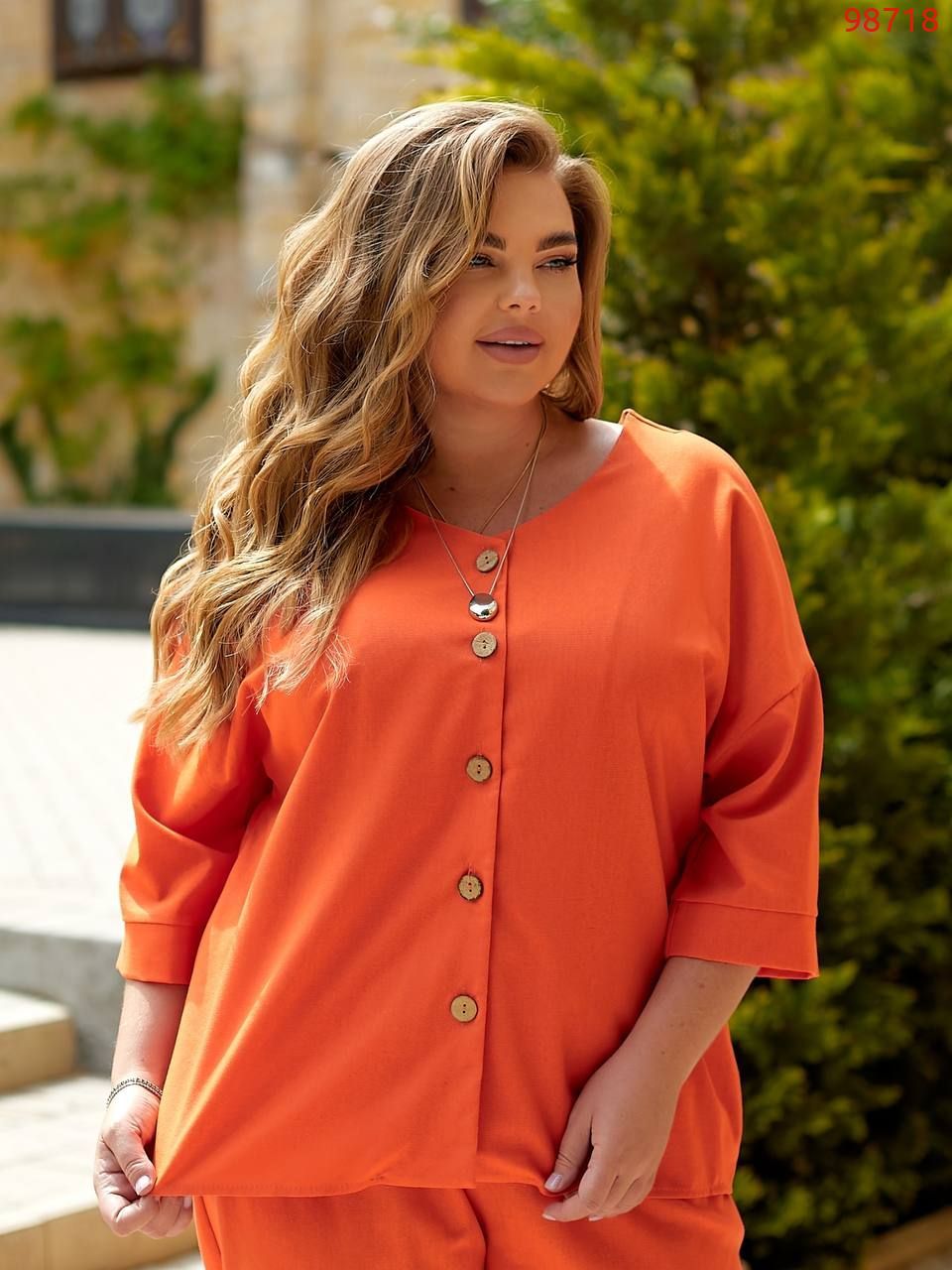 Сорочка з V-подібним вирізом та гудзиками по центру. Рукави широкі та вкорочені, довжиною до ліктя. Крій вільний, що забезпечує комфорт та легкість рухів.