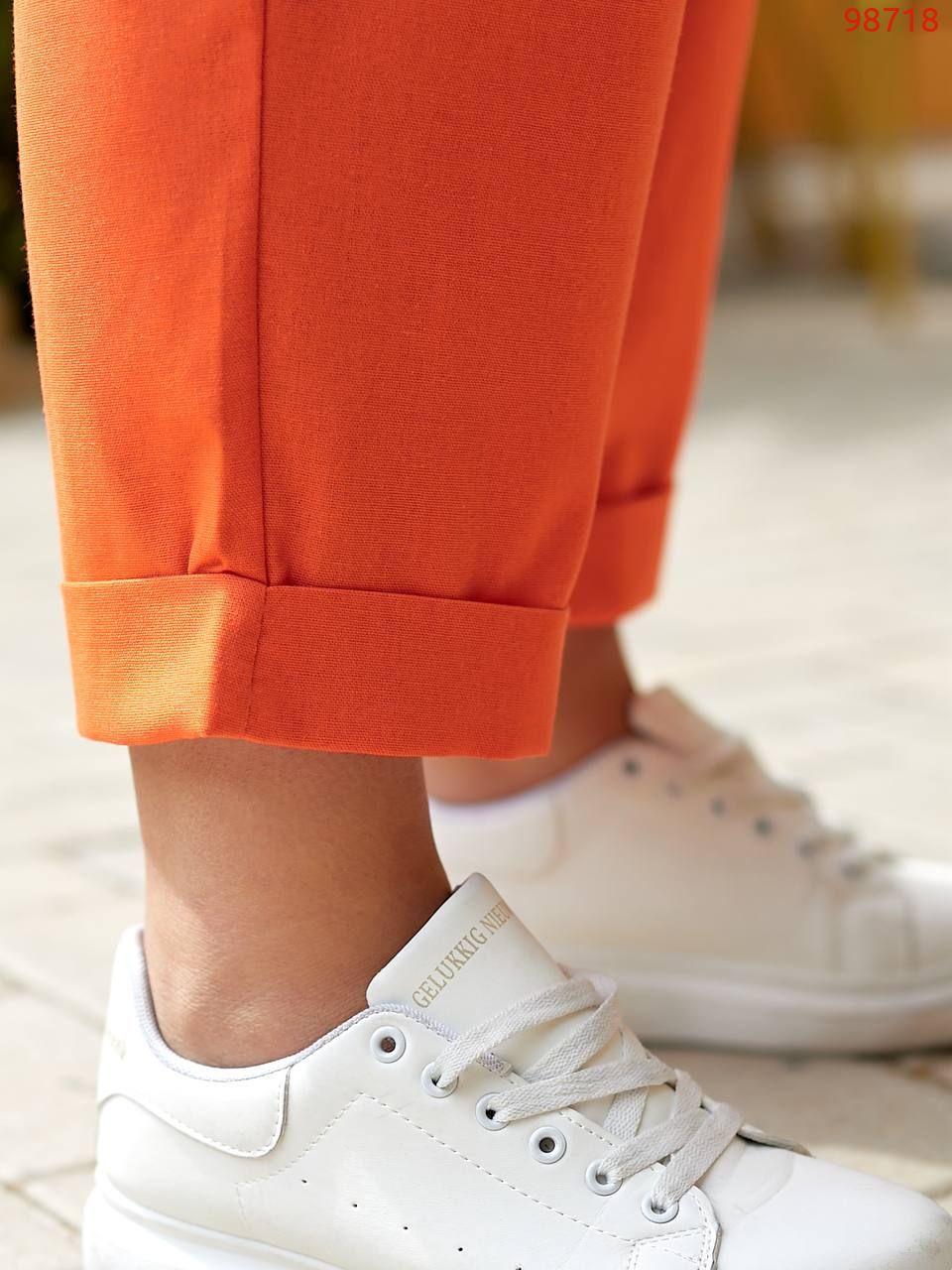 Прямі вкорочені штани з підворіттям на штанинах. Вони також виконані у вільному стилі, що підкреслює загальний розслаблений та елегантний образ