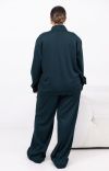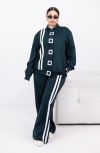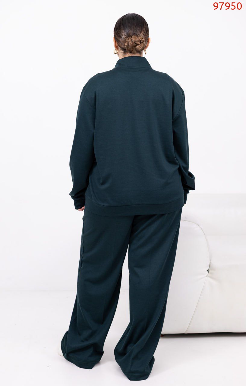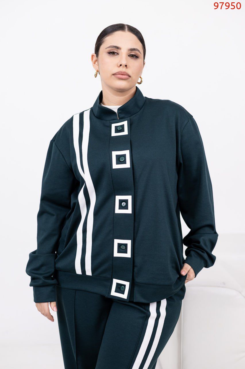 Стильний брючний костюм з еластичної тканини для тих, хто цінує баланс комфорту й елегантності. Лампаси додають динаміки, а геометричний декор (квадрат) на кофті – стильний акцент. Кофта на ґудзиках по всій довжині з прорізними кишенями. Вільні штани середньої посадки з еластичною резинкою на поясі – зручні на щодень і для поїздок.