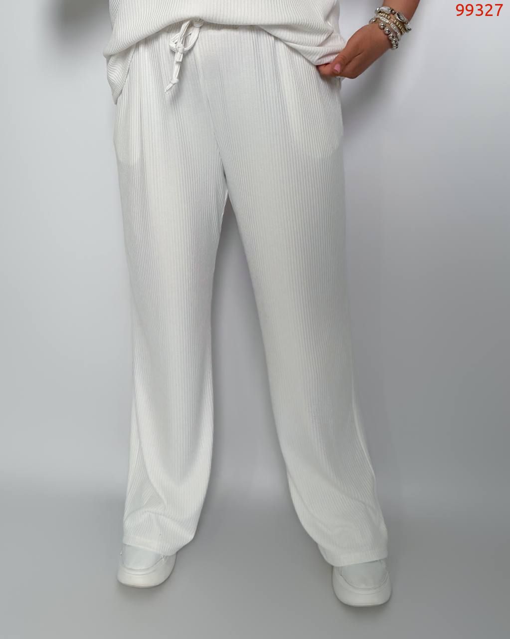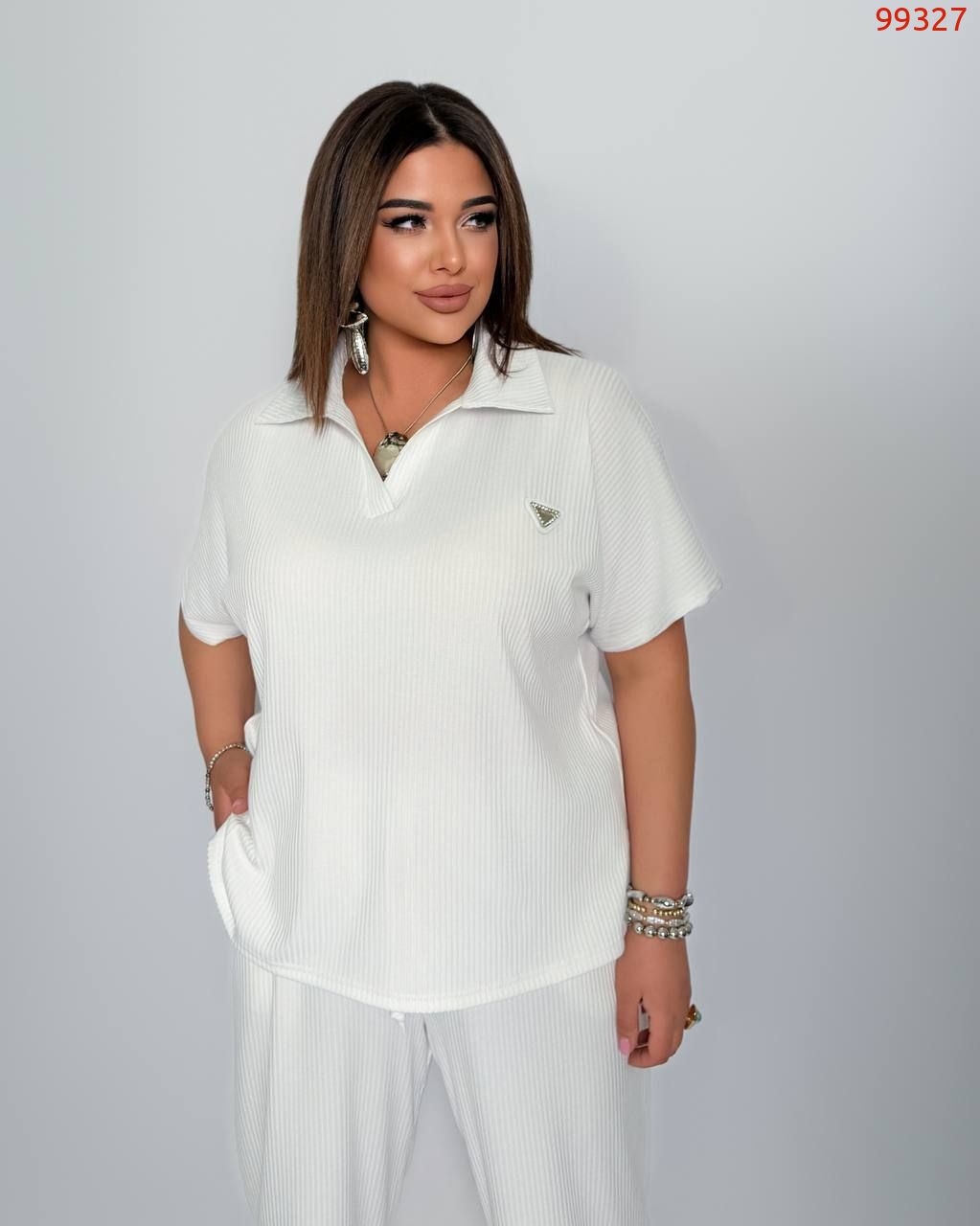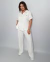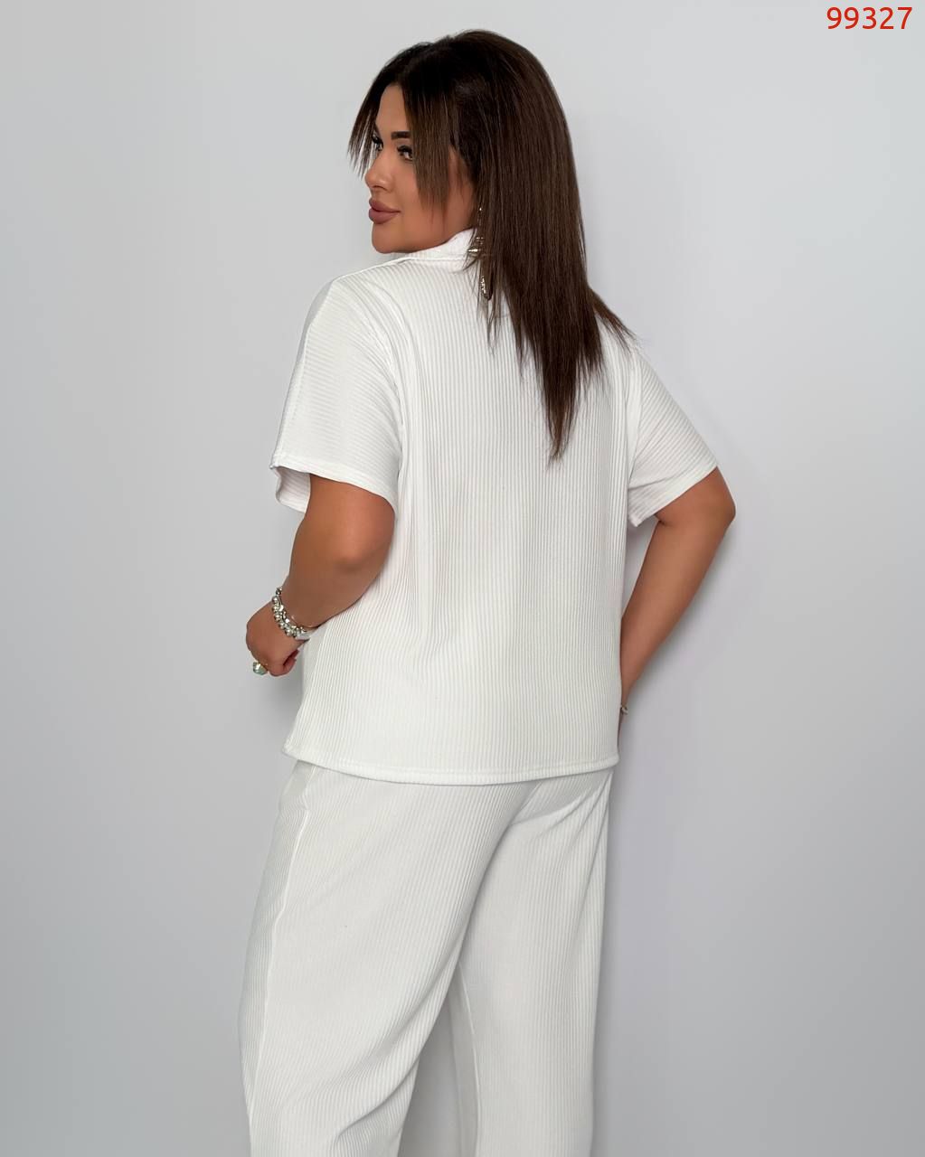 Стильний комфортний костюм “Barcelona” з трикотажу рубчик хб стрейч: футболка у стилі поло оверсайз з Акс + штани прямі розширені з високою посадкою з кішенями у бічних швах, з куліскою на поясі