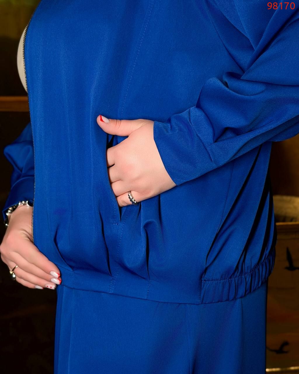 Кофта-бомбер. Вільний крій, спереду понизу мʼякі склади, позаду- на резинці, що дозволяє зробити бажану фіксацію, застібка на блискавку. Спущена лінія плеча, обʼємний рукав із манжетом.