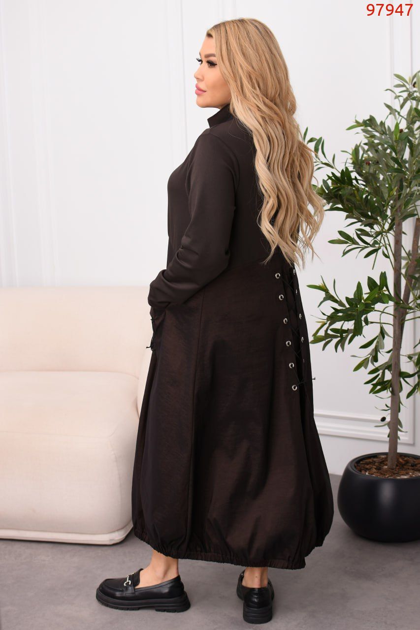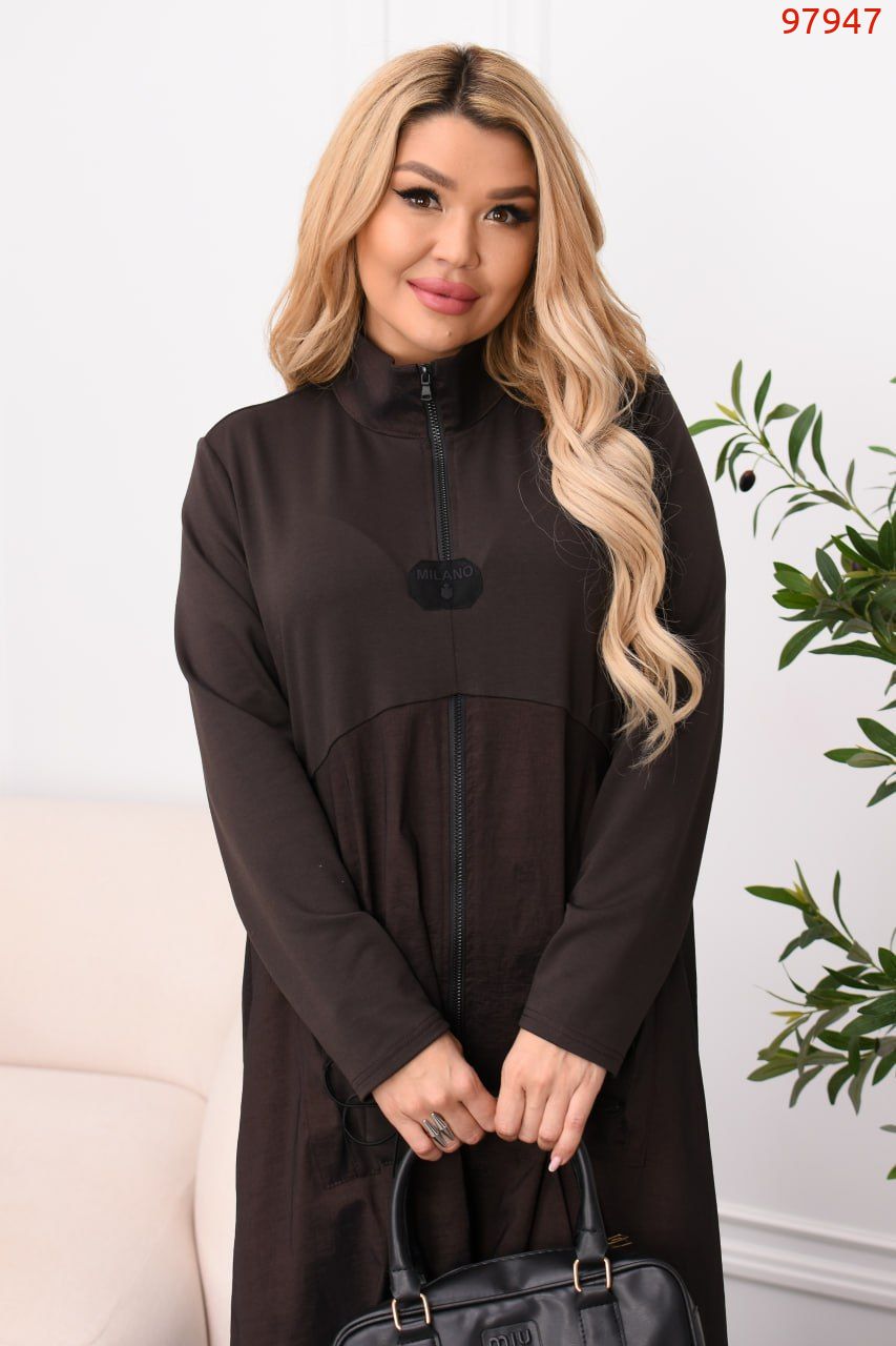 Легка елегантність з акцентом на комфорт: спортивні деталі зустрічаються з міським шиком. Стійка-горловина з блискавкою до рівня грудей + окрема блискавка від грудей донизу, комбінована фактура (двонитка + жатa плащівка), дві накладні кишені. Ззаду – декоративна шнурівка для регулювання об’єму на талії. Низ на резинці для охайної посадки.