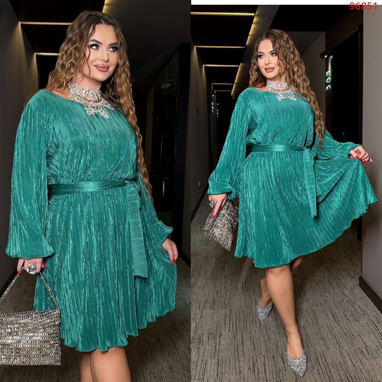 Святкова сукня з широкими рукавами , талія на резинці , пояс з основної тканини .