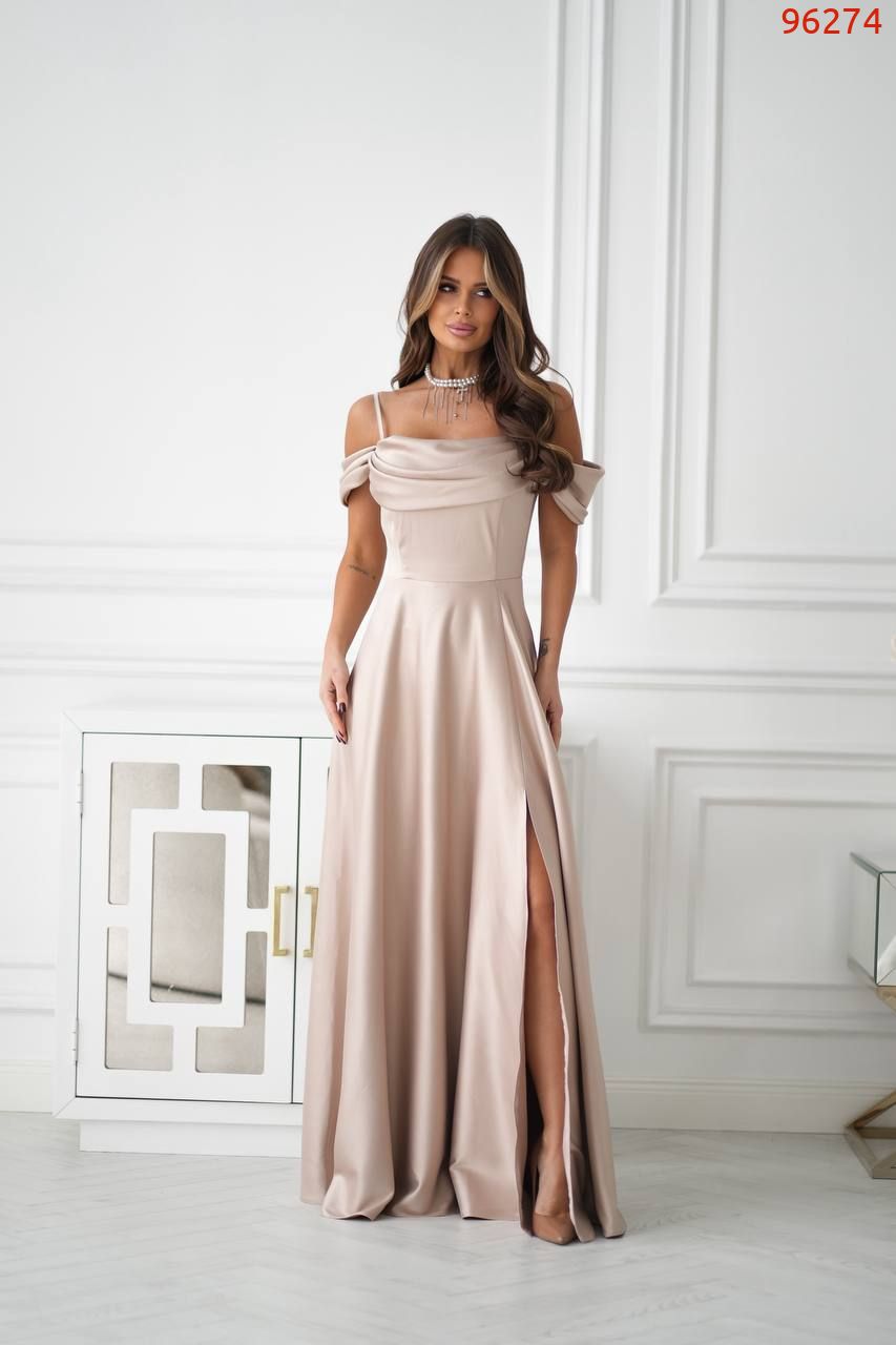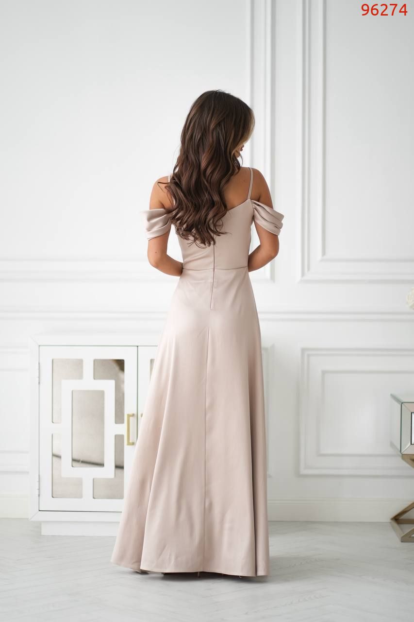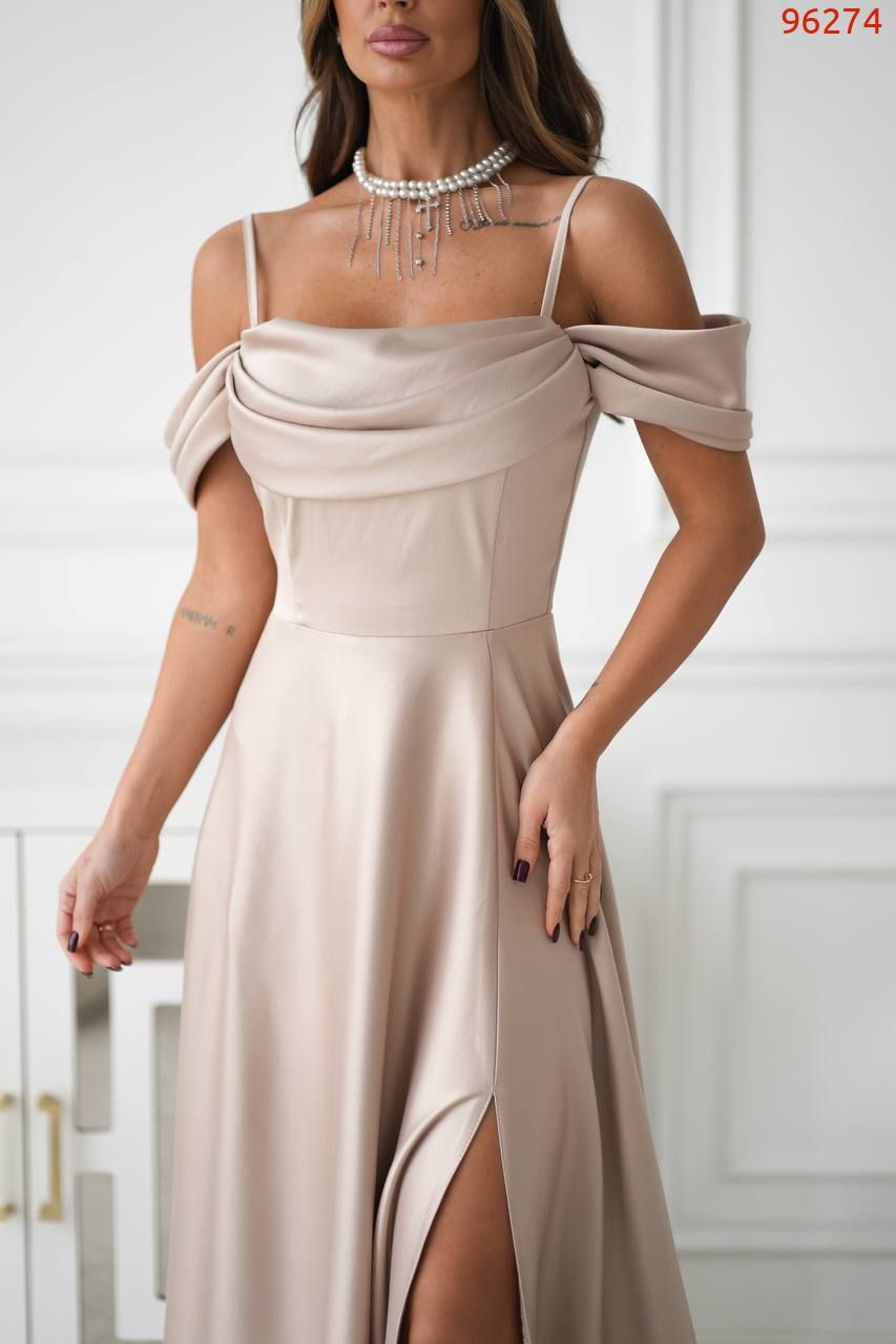 Атласна сукня зі спущеними рукавамина брителях, озлобленна драпіруванням у зоні декольте, що надає образу витонченості та жіночності. Сукня ідеально підходить для особливих випадків, таких як весілля, вечірки або фотосесії.
