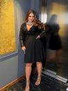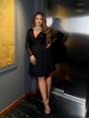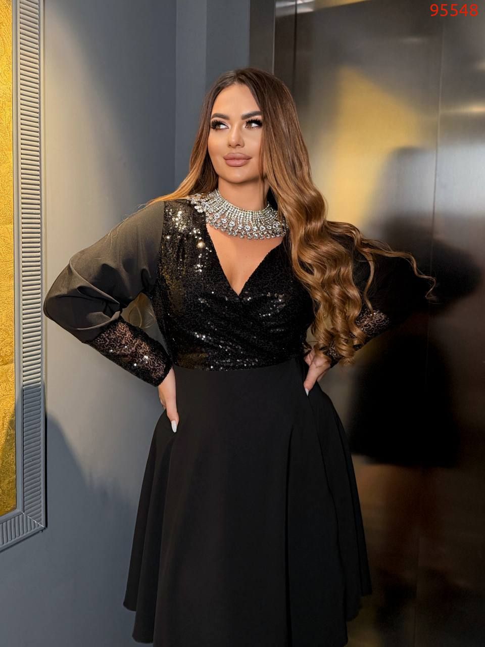 Тканина:верх - оксамит, розшитий паєтками (стрейчевий). Низ – софт -шовк чорного кольору. Одягається на запах.
