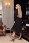 Тканина: костюмнй креп. Оздоблення - пір'я марабу, довжина 120 см, збоку розріз, застібка - блискавка. Ззаду шнурується- цим регулюється приталеність.