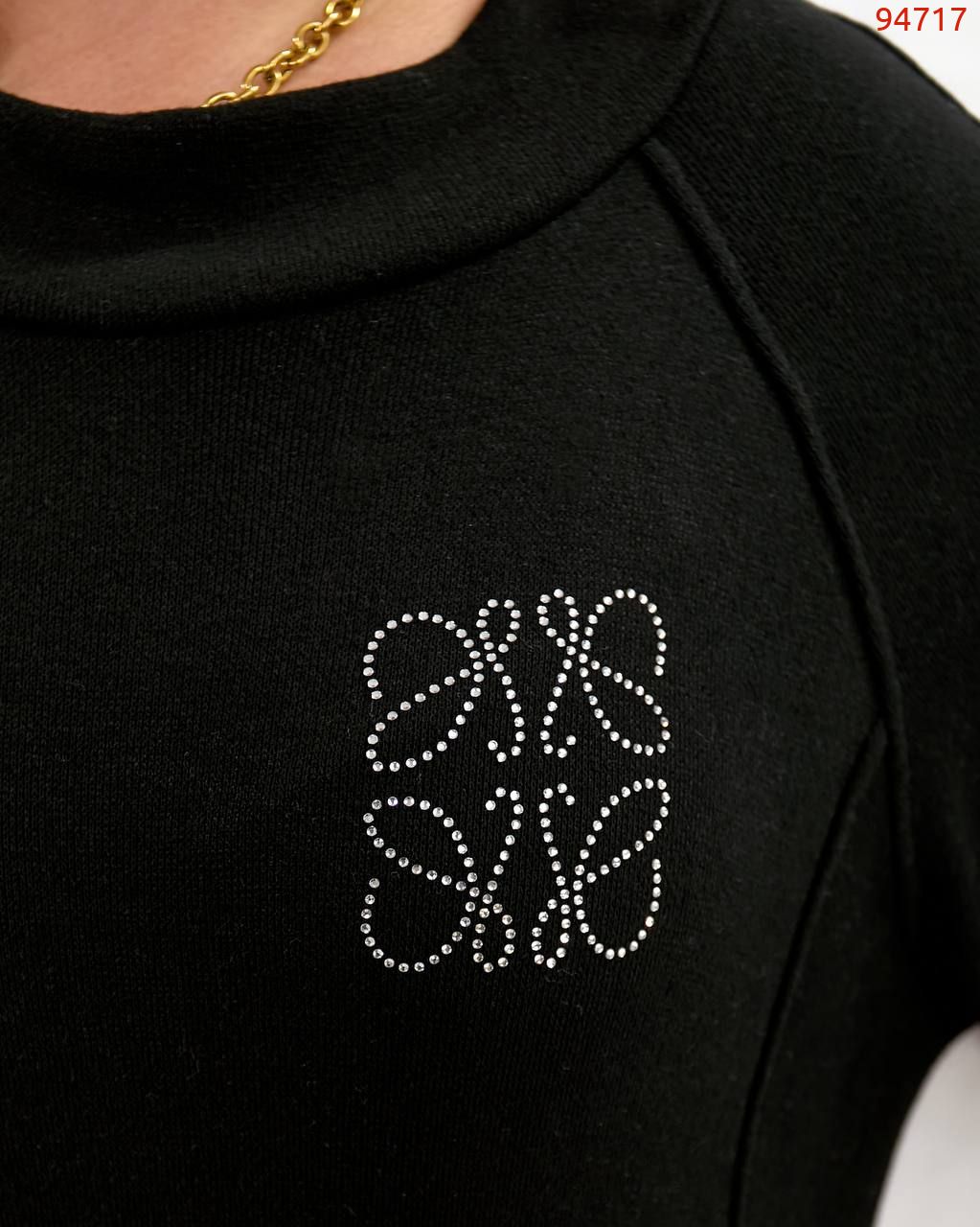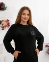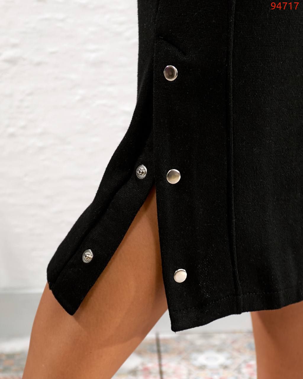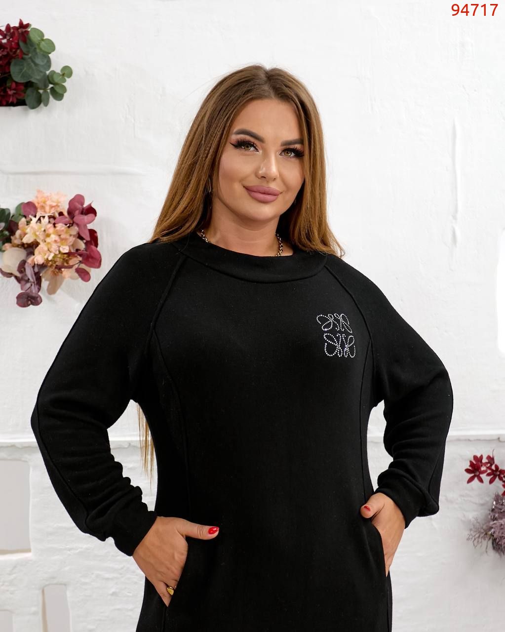 Сукня вільного крою, на грудях- прикраса зі страз, рукав реглан, з кишенями, знизу з розрізами на кнопках.