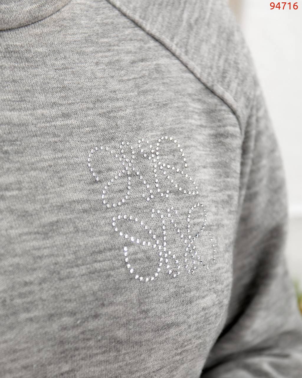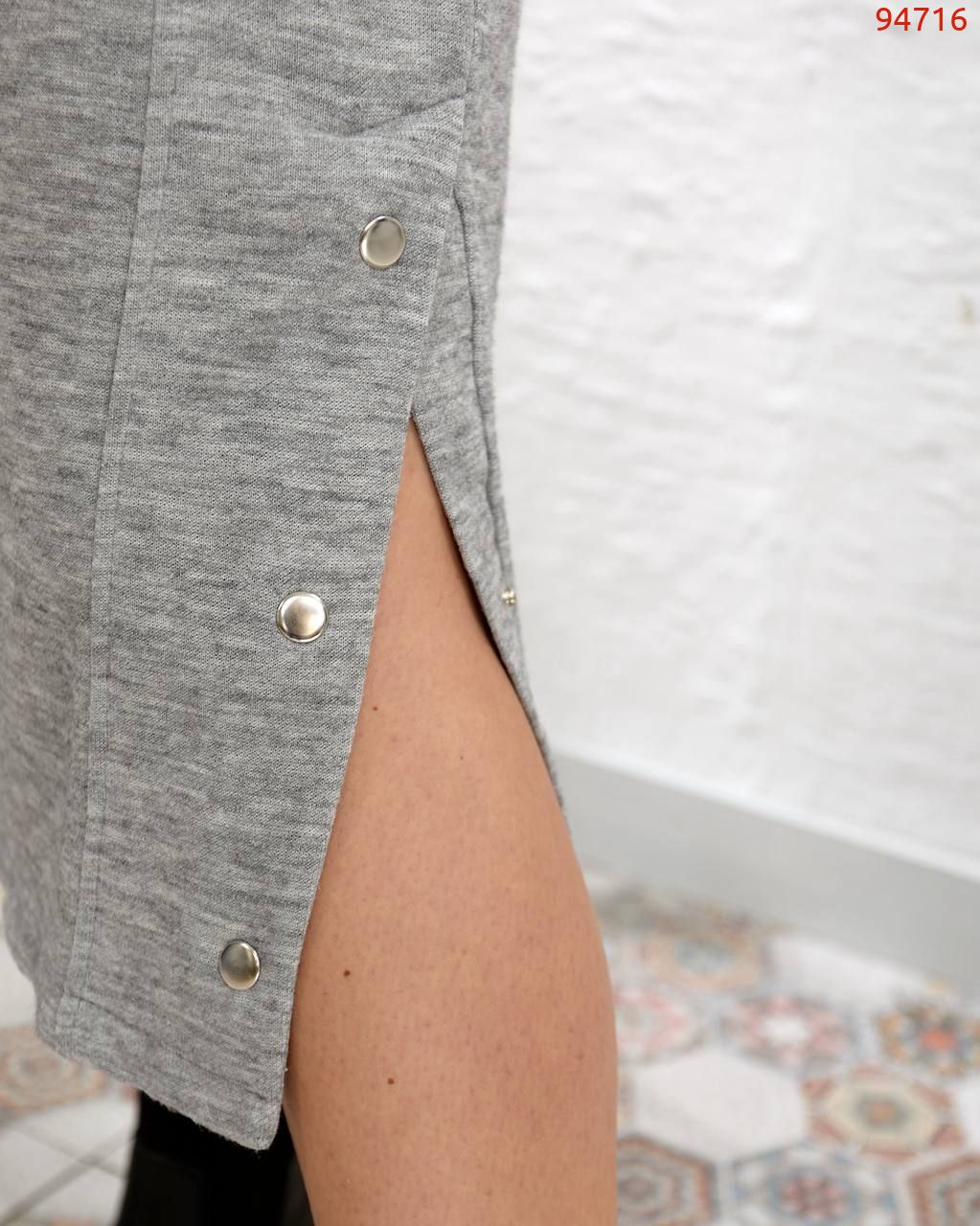 Сукня вільного крою, на грудях- прикраса зі страз, рукав реглан, з кишенями, знизу з розрізами на кнопках.