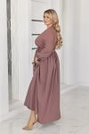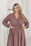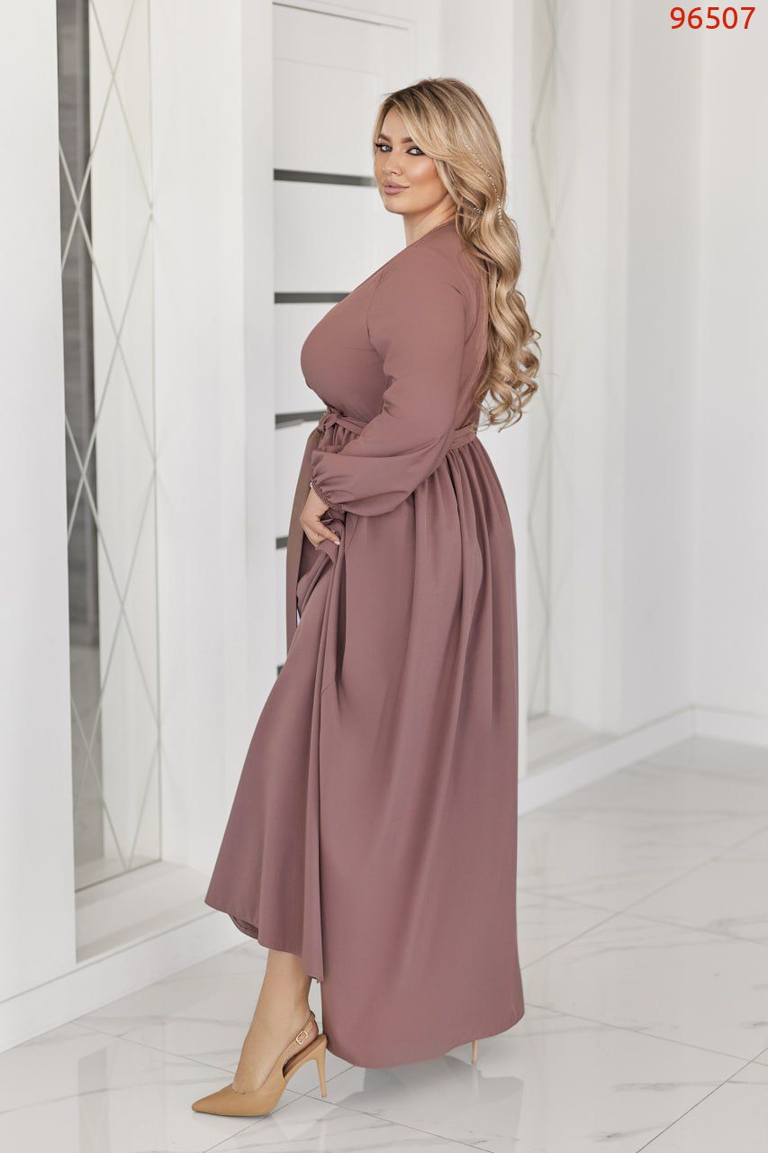 Неймовірно жіночна довга сукня у вечірньому стилі із софта (легка тканина. розтяжності немає). Ліф сукні виконано на запАх. Рукави довгі, на резинці по низу. Талія відрізна, зібрана на резинку. Спідниця форми сонцекльош. Пояс із основної тканини в комплекті. Застібок, кишень немає.