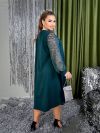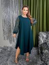 Силует сукні у вигляді трапеції, завдяки чому чудово маскує будь-які недоліки фігури та підкреслює її переваги. Виріз горловини круглий. Рукави на манжетах, виконані із гарного гіпюру в тон основної тканини. Низ сукні асиметричний. Застібок кишень немає.