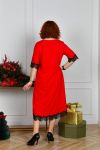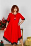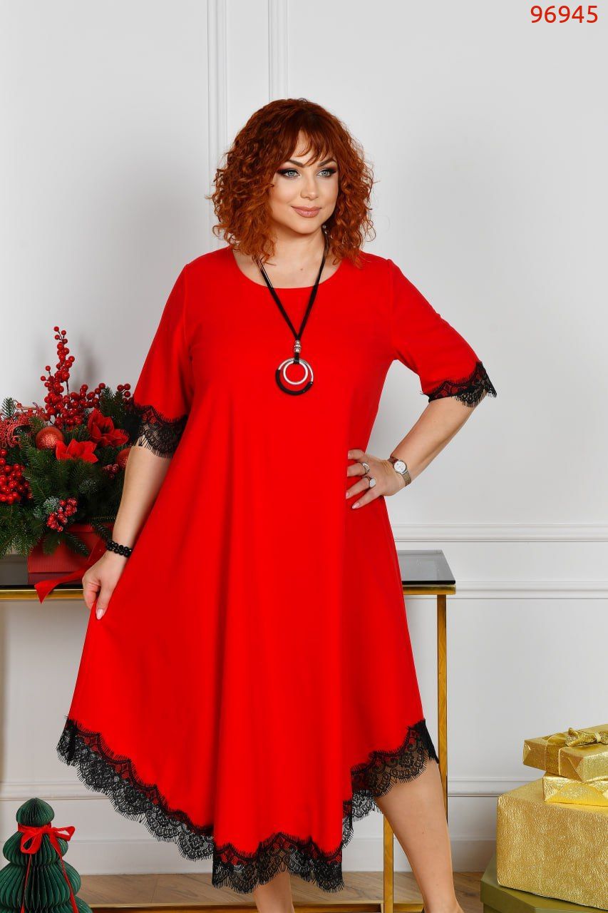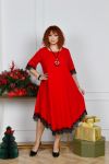 Неймовірно стильна сукня у вечірньому стилі, довжиною міді, А-подібного силуету. Виріз горловини круглий. Рукав довжиною трохи нижче ліктя. Сукня по рукавам та низу декорована чорним мереживом. Кишень та застібок немає.