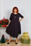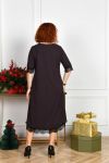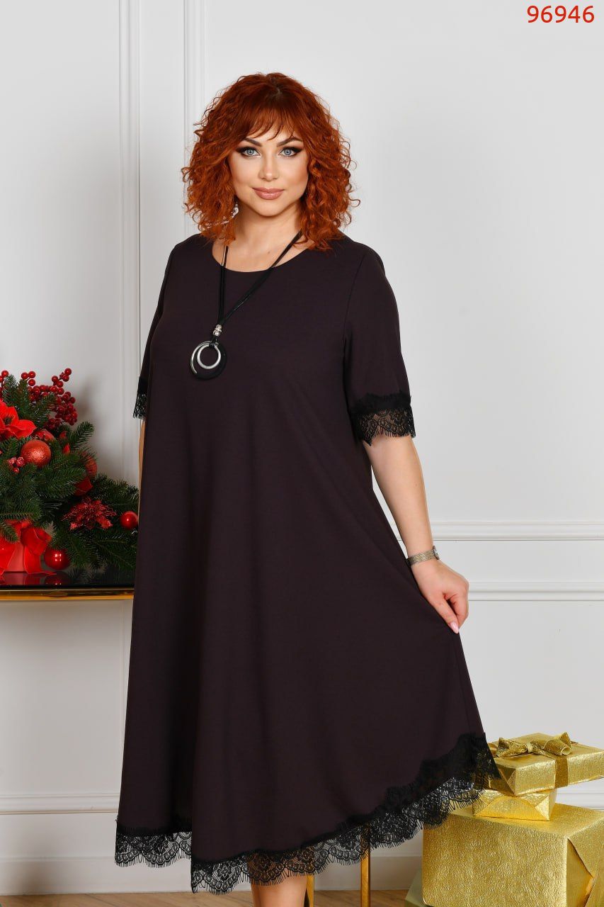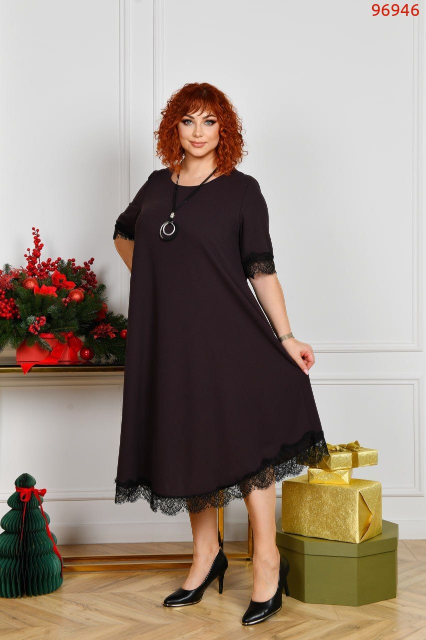 Неймовірно стильна сукня у вечірньому стилі, довжиною міді, А-подібного силуету. Виріз горловини круглий. Рукав довжиною трохи нижче ліктя. Сукня по рукавам та низу декорована чорним мереживом. Кишень та застібок немає.