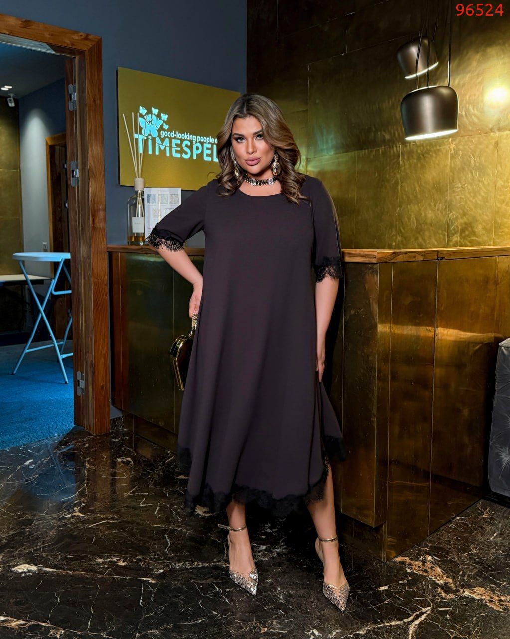 Неймовірно стильна сукня у вечірньому стилі, довжиною міді, А-подібного силуету. Виріз горловини круглий. Рукав довжиною трохи нижче ліктя. Сукня по рукавам та низу декорована чорним мереживом. Кишень та застібок немає.