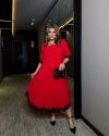 Неймовірно стильна сукня у вечірньому стилі, довжиною міді, А-подібного силуету. Виріз горловини круглий. Рукав довжиною трохи нижче ліктя. Сукня по рукавам та низу декорована чорним мереживом. Кишень та застібок немає.