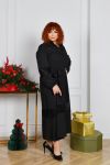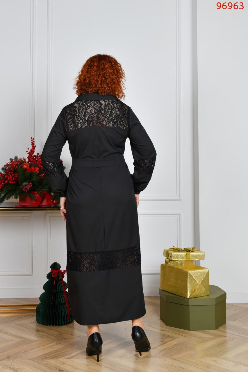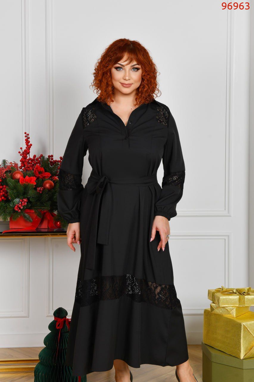 Силует у вигляді трапеції, талію можна падкреслити за допомогою поясу із основної тканини. По горловині стояче-відкладений комірець, попереду коротка планка із гудзиками. Рукави довгі, по низу на резиночці. Сукня декорована дуже якісним та гарним гіпюром. Кишень немає. Можна носити з поясом та без нього.