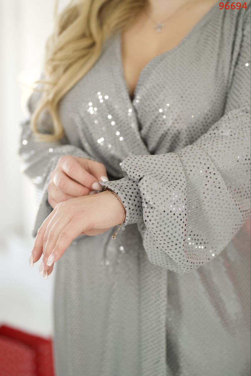 Сукня на запах з паєтками - це вишукана сукня, що створює V-подібний виріз завдяки полотнищам, що перекриваються, яке доповнене блискучими паєтками, що роблять його ідеальним для вечірніх виходів. Пасок підкреслює талію і робить гарний силует, рукава ідіуть фанатиком