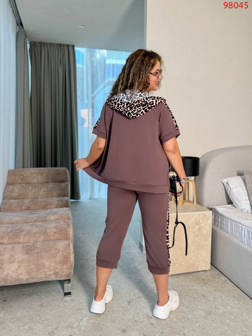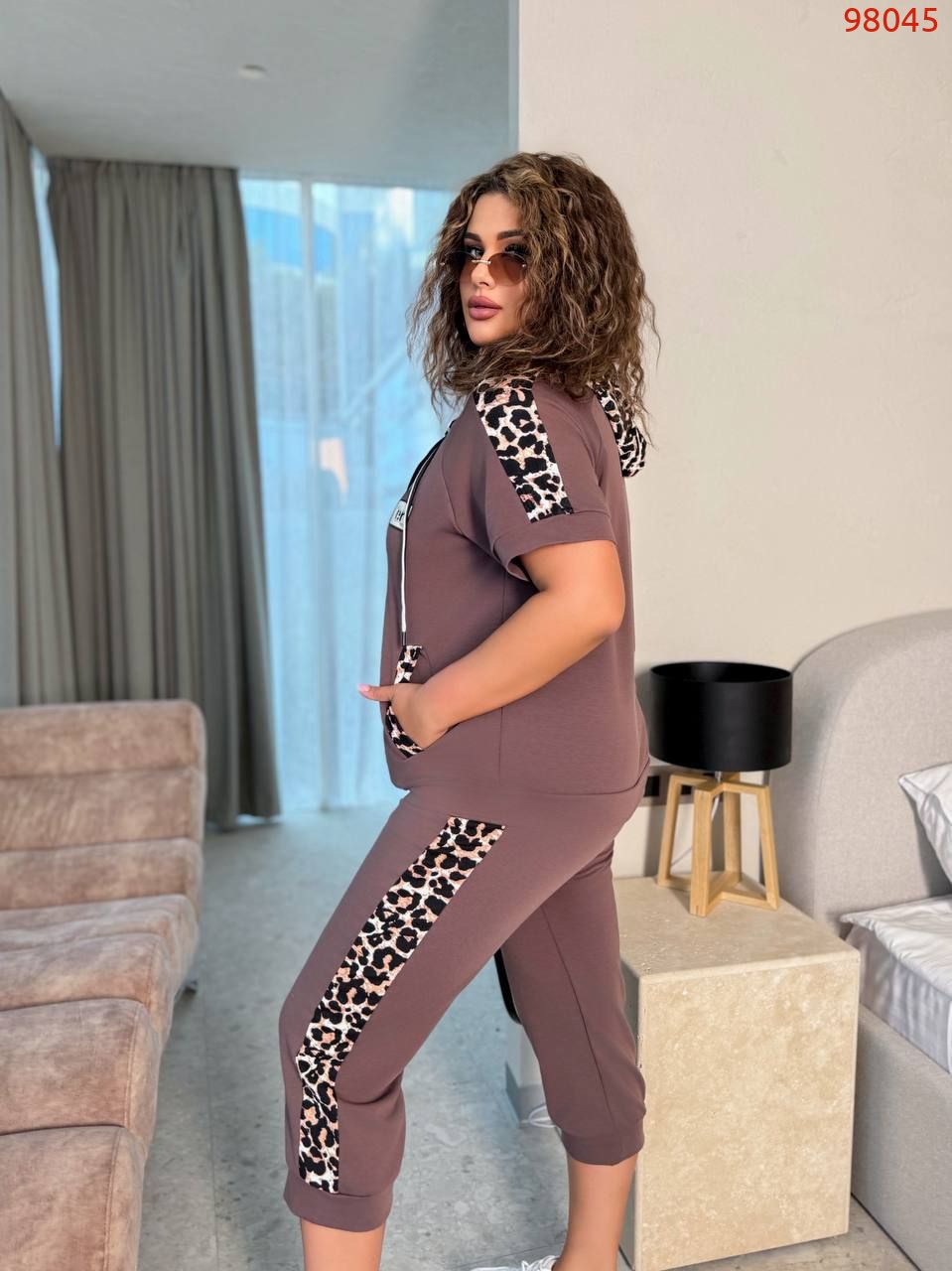 Кофта вільного силуету з капюшоном , кишені листочки. Прикрашений вставками з леопарда і обструкції. Рукав на манжеті.