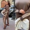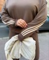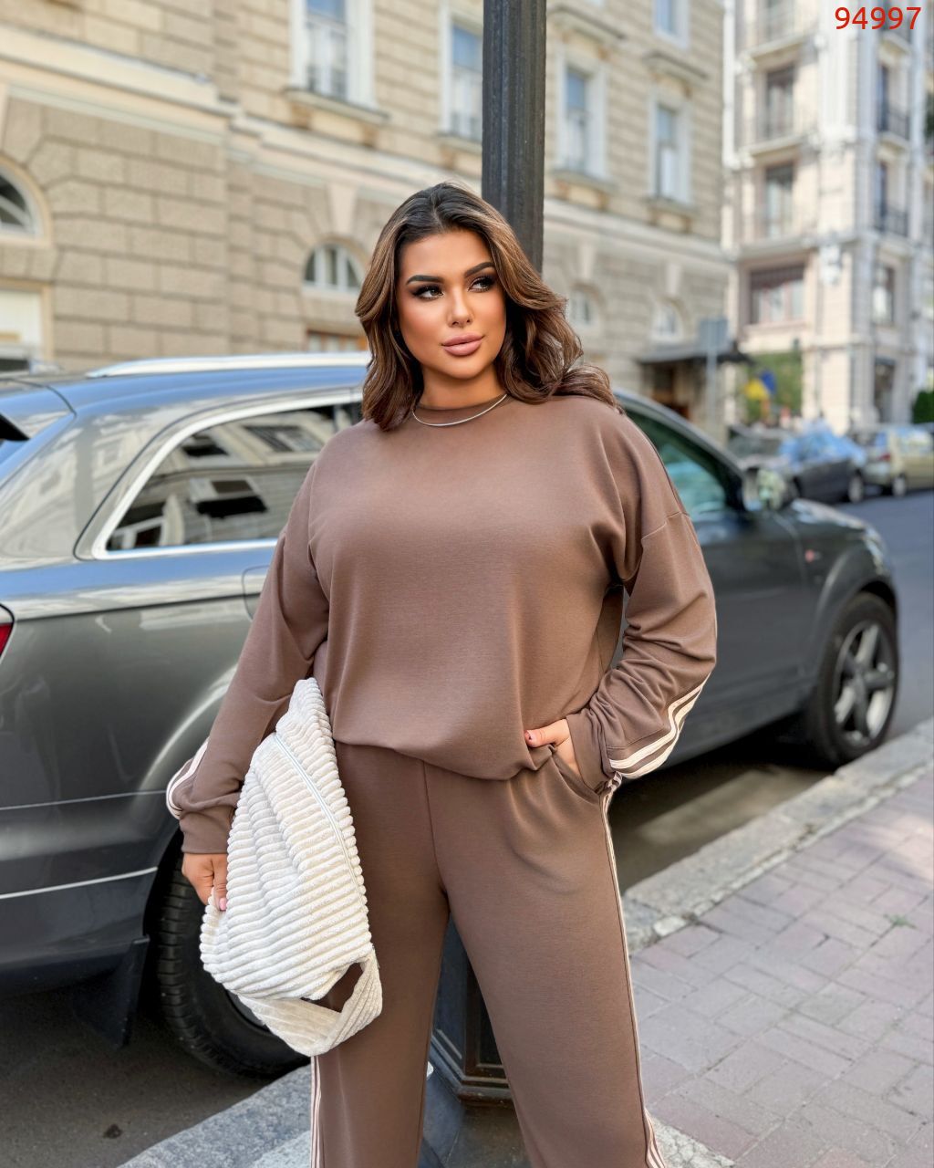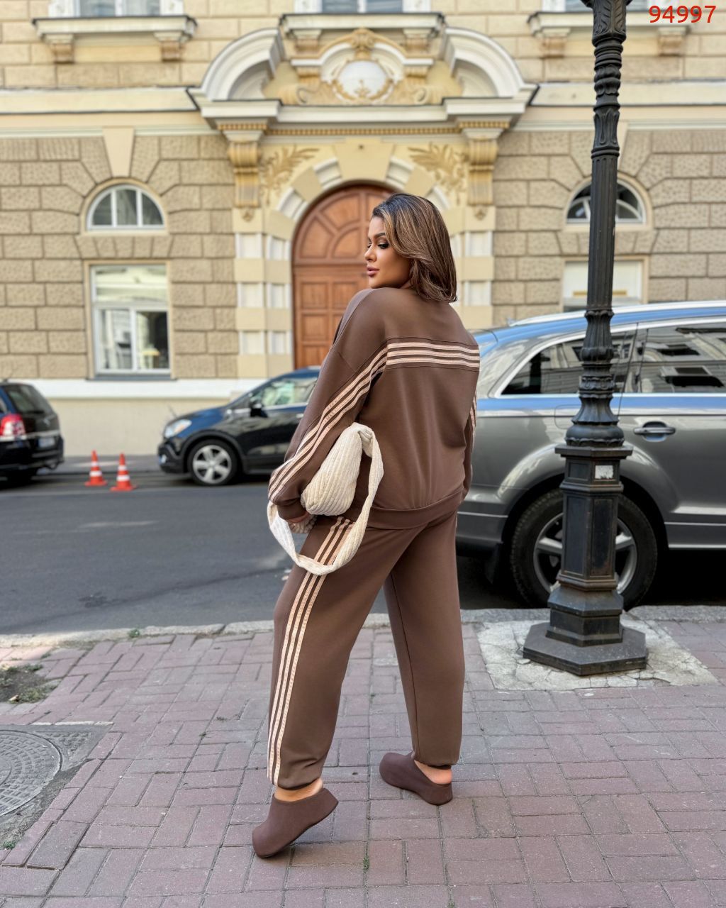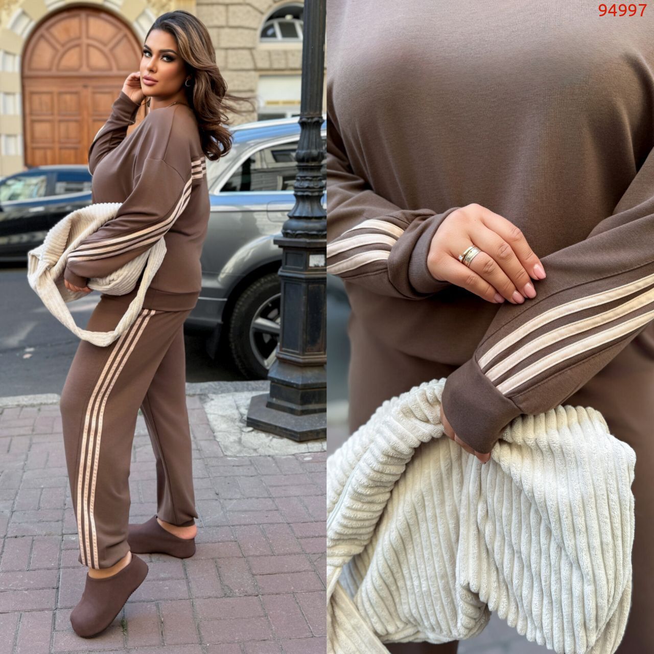Стильний прогулянковий костюм, штани на високій посадці, кругова резинка, манжети. Кофтинка вільного крою, декорована стильними лампасами. Костюм виготовлений с двунитки, гарна розтяжність.