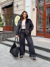 Широкі прямі штани з того ж матеріалу та кольору створюють ефектний і розслаблений силует.
