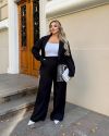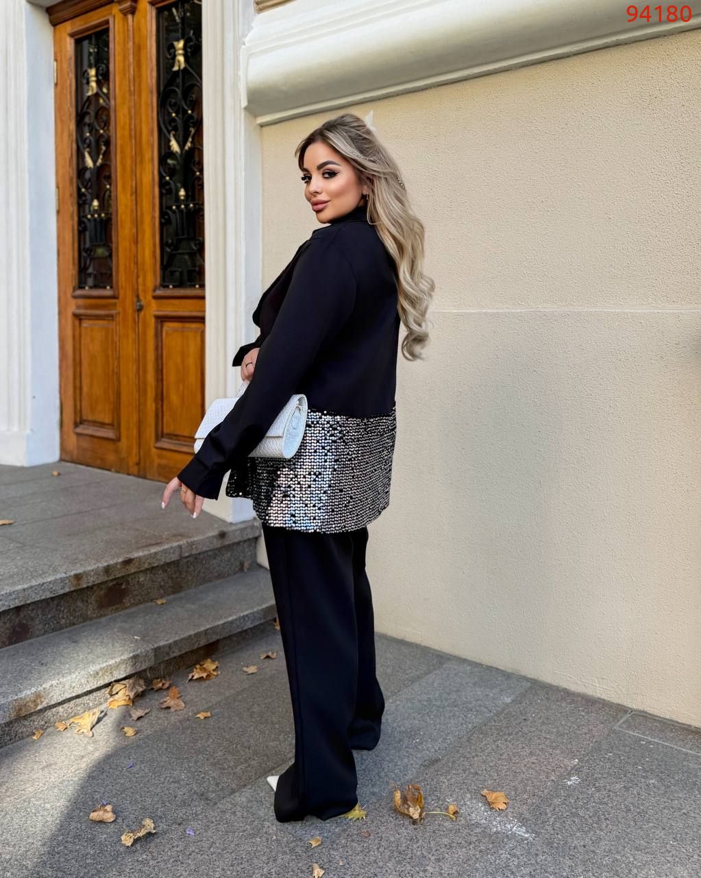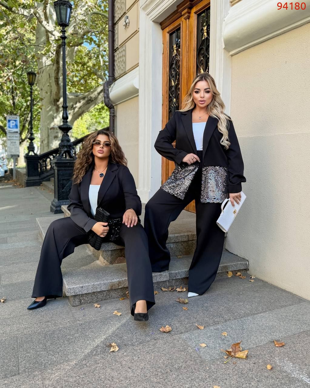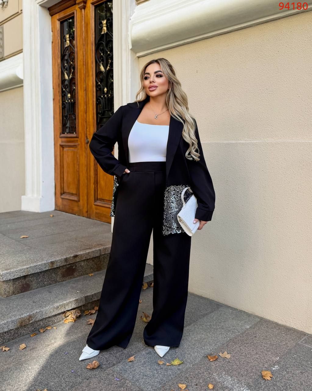 Стильний жіночий костюм .Подовжений піджак, прямого крою, з класичним коміром .Широкі штани. Цей костюм відмінно підійде для повсякденних, ділових та стильних образів, святкових вечорів