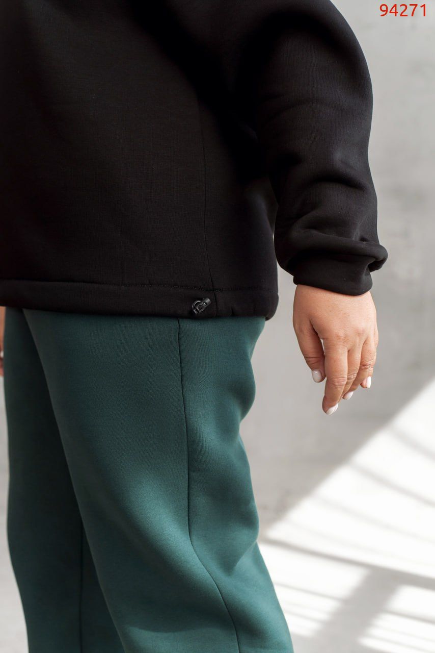 Теплий костюм із тринитки на флісі – втілення затишку та стилю. Його високоякісна тканина приємно огортає тіло, даруючи відчуття тепла й комфорту, зберігаючи при цьому ідеальний вигляд: не кошлатиться та не втрачає форми. Кофта вільного крою із заниженою лінією плеча виглядає невимушено та сучасно. Капюшон зі шнурком через люверси та акуратні затяжки по низу створюють елегантний акцент. Штани з високою посадкою, м’якою гумкою на талії, кишенями та манжетами додають образу гармонійності та практичності. Цей костюм – не просто одяг, а ваша особиста територія тепла, де стиль і комфорт живуть в ідеальній рівновазі. Пояс НЕ входить в комплект.