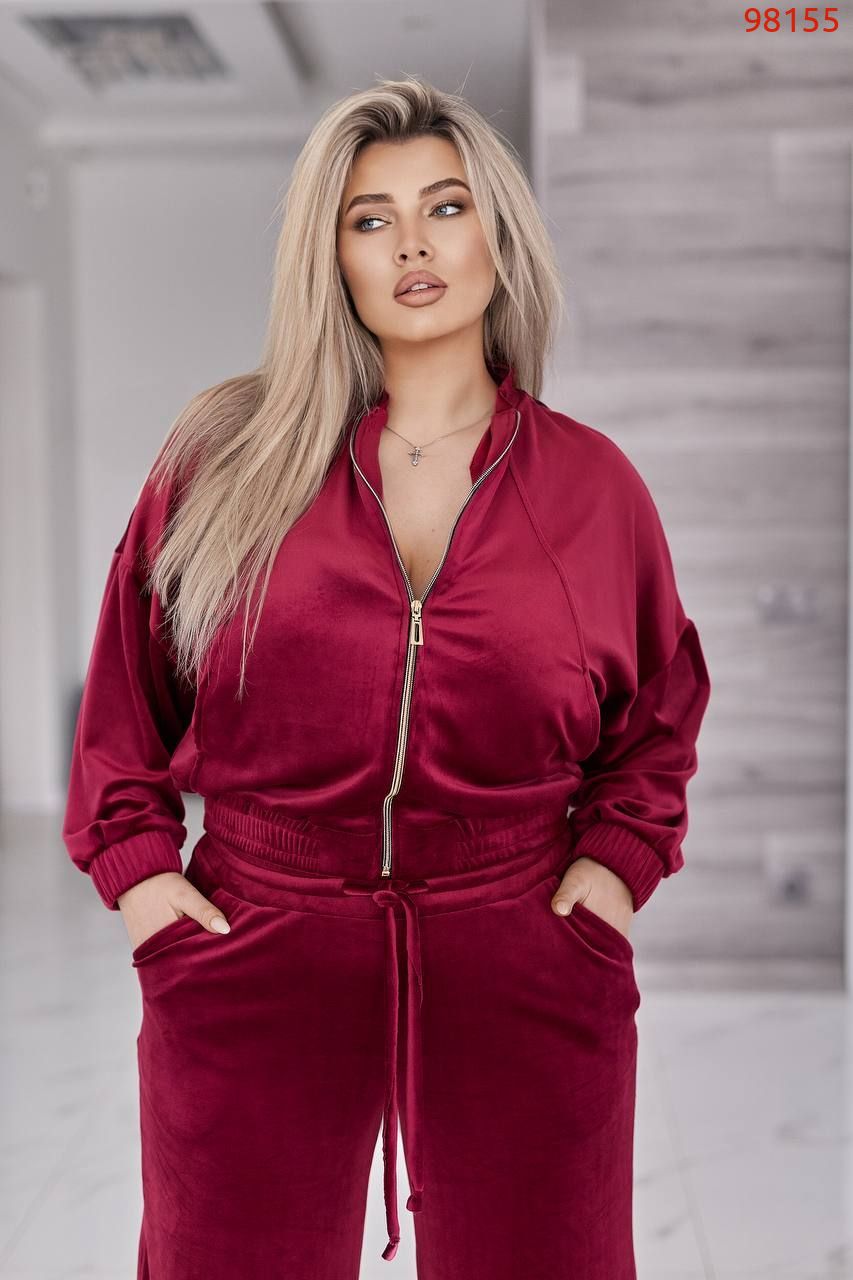 Велюровий оксамитовий костюм складається з кофти і штанів. Кофта вільного крою oversize, з застібкою блискавкою і коміром стійкою. В рельєфних швах спереду є кишені. Рукав зі спущеною лінією плеча, манжети на рукавах та низ кофти на еластичній широкій резинці.