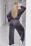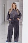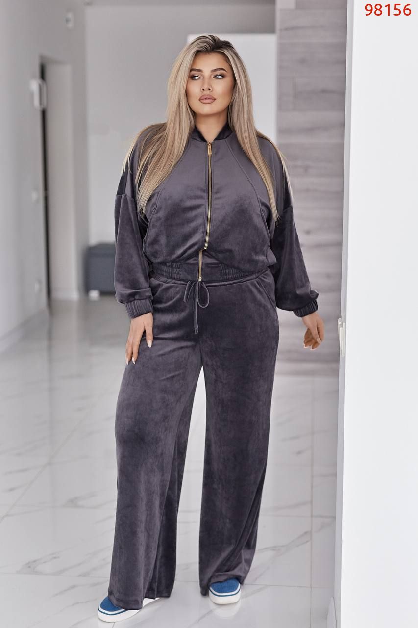 Велюровий оксамитовий костюм складається з кофти і штанів. Кофта вільного крою oversize, з застібкою блискавкою і коміром стійкою. В рельєфних швах спереду є кишені. Рукав зі спущеною лінією плеча, манжети на рукавах та низ кофти на еластичній широкій резинці.
